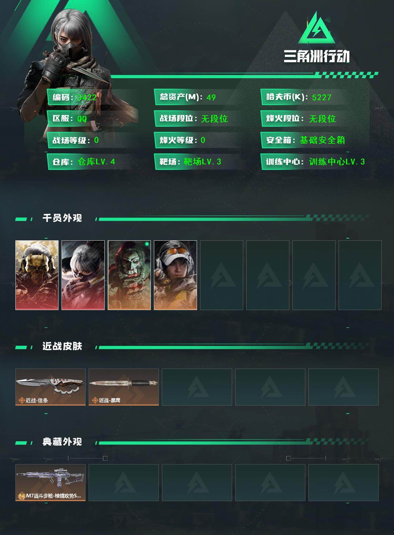 LJ3325总资产49.1M哈弗币5227K近战武器-信条,近战武器-黑鹰露娜金牌射手,骇爪水墨云图,红狼蚀金玫瑰,红狼电锯惊魂M7战斗步枪-棱镜攻势S2(优品C)无AW子弹三角币280仓库LV.7高级安全箱靶场LV.4训练中心LV.6无,露娜-金牌射手,骇爪-水墨云图,红狼-蚀金玫瑰,红狼-电锯惊魂,近战-信条,近战-黑鹰,M7战斗步枪-棱镜攻势S2