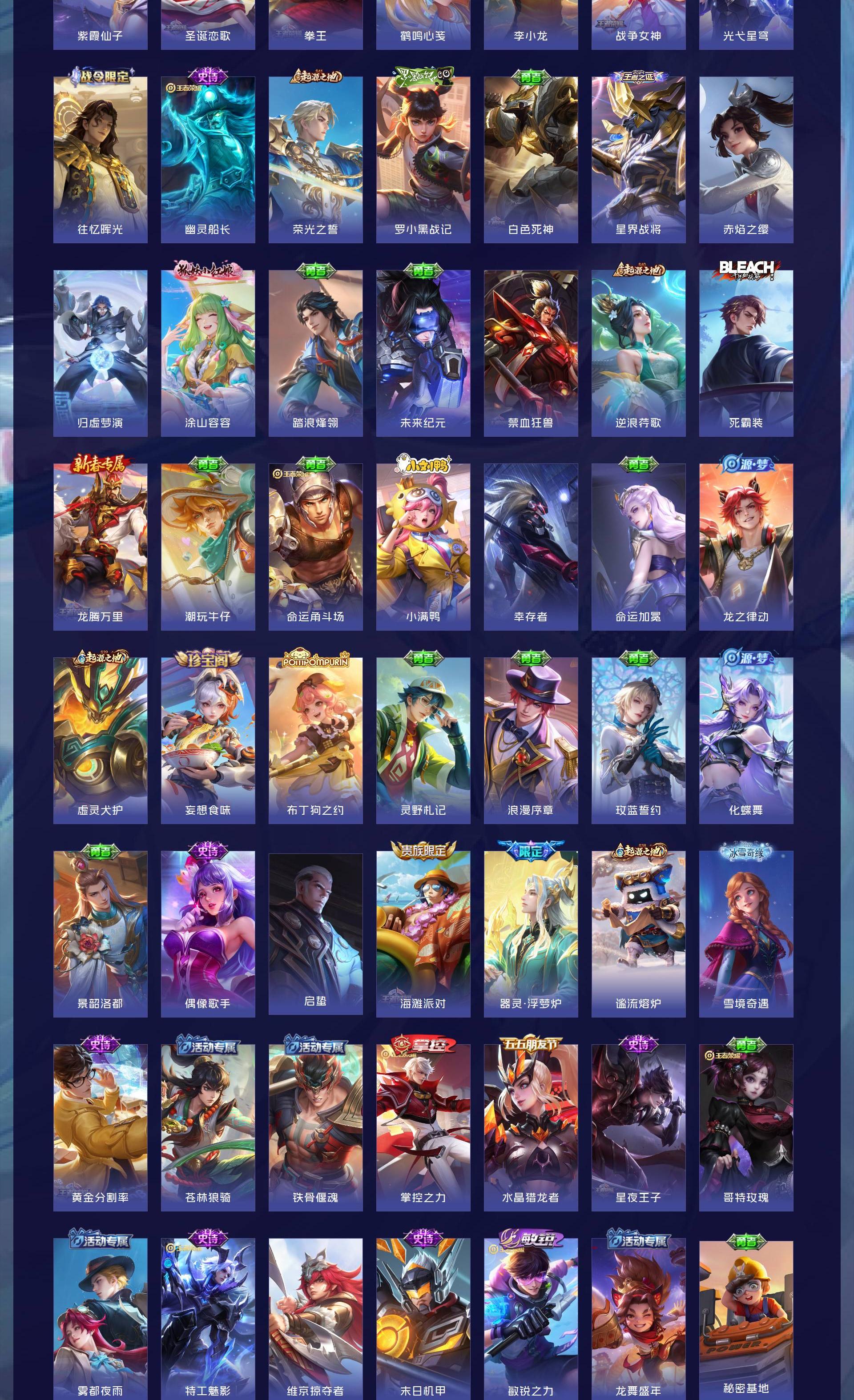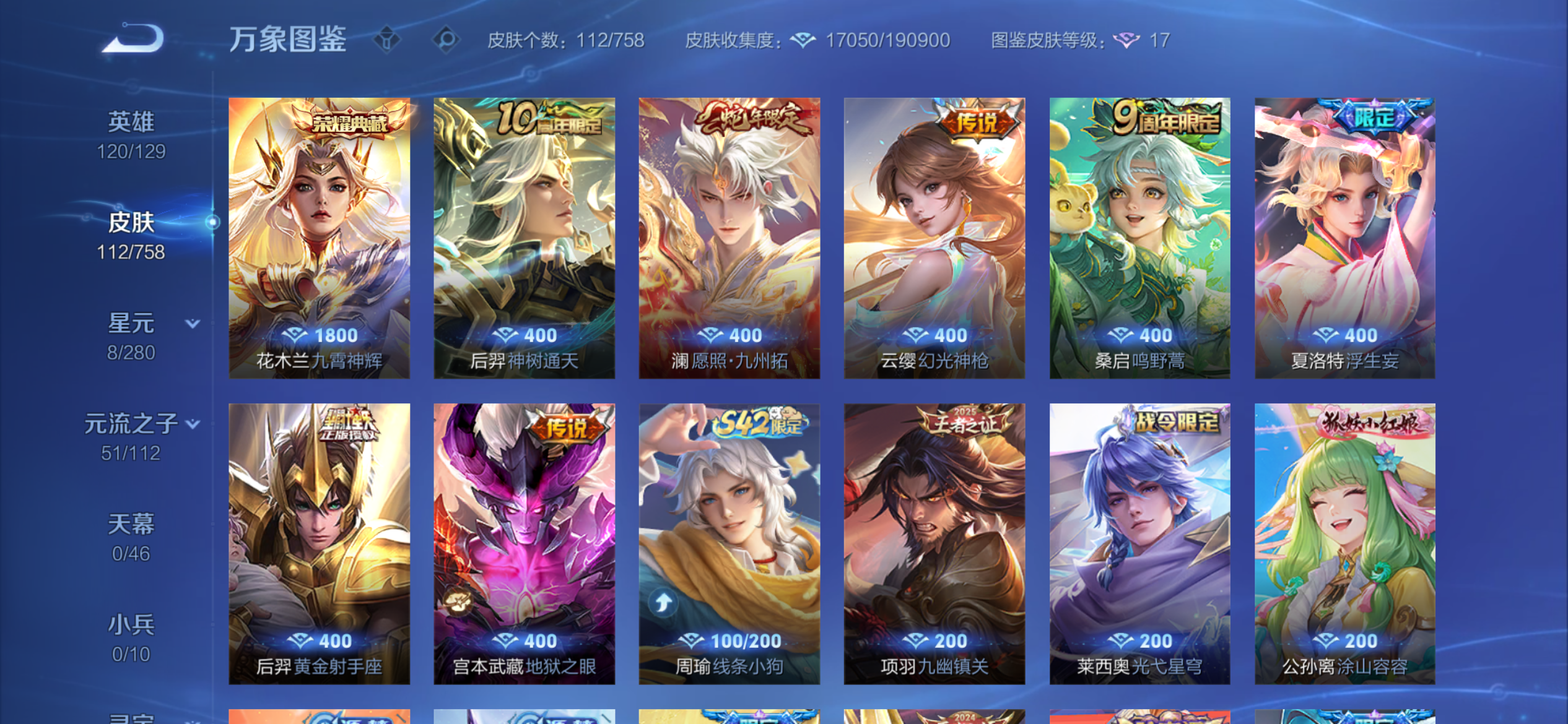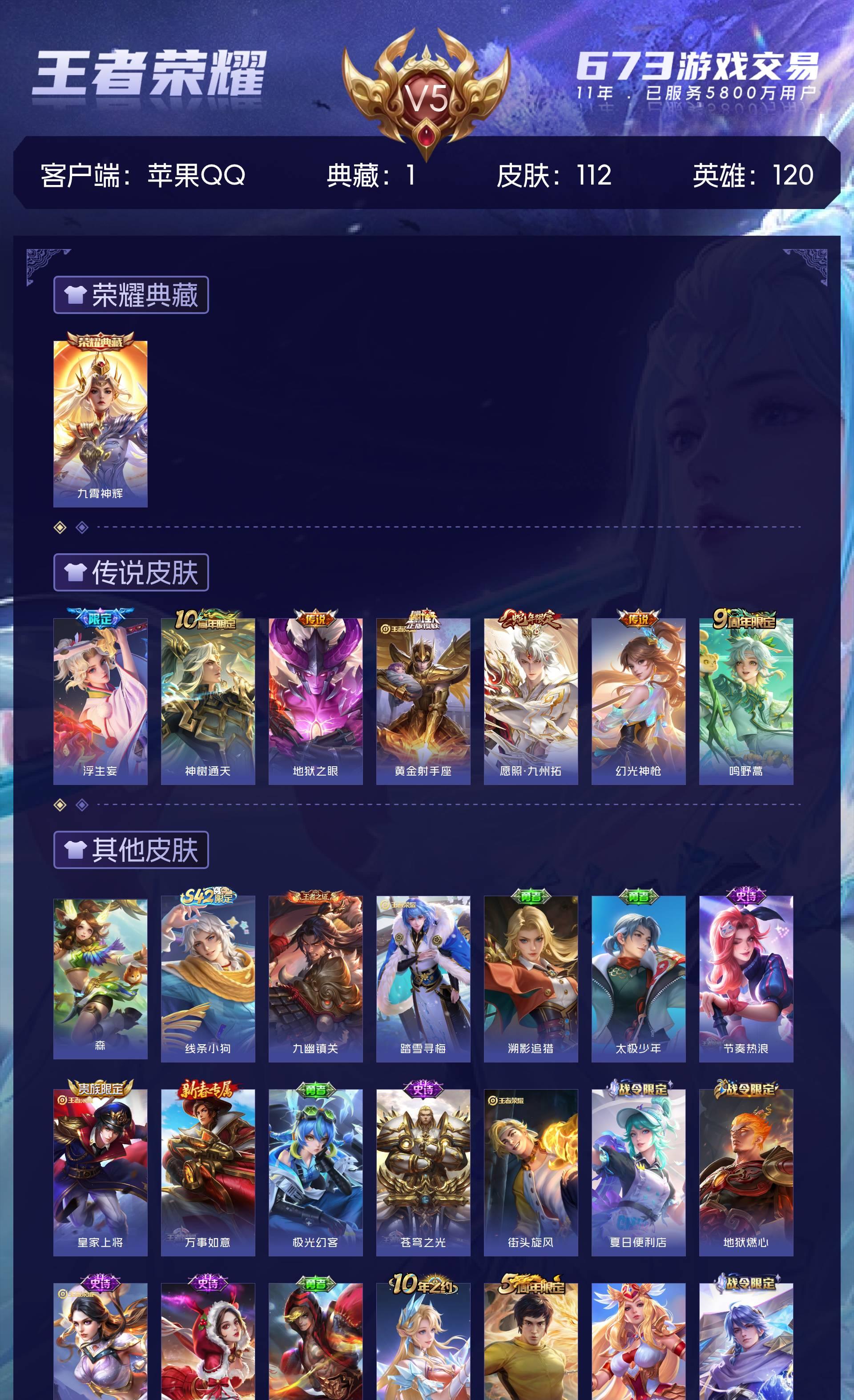 V5 皮肤112 英雄120 永恒钻石 荣耀典藏1 星传说1 传说7 其他皮肤109