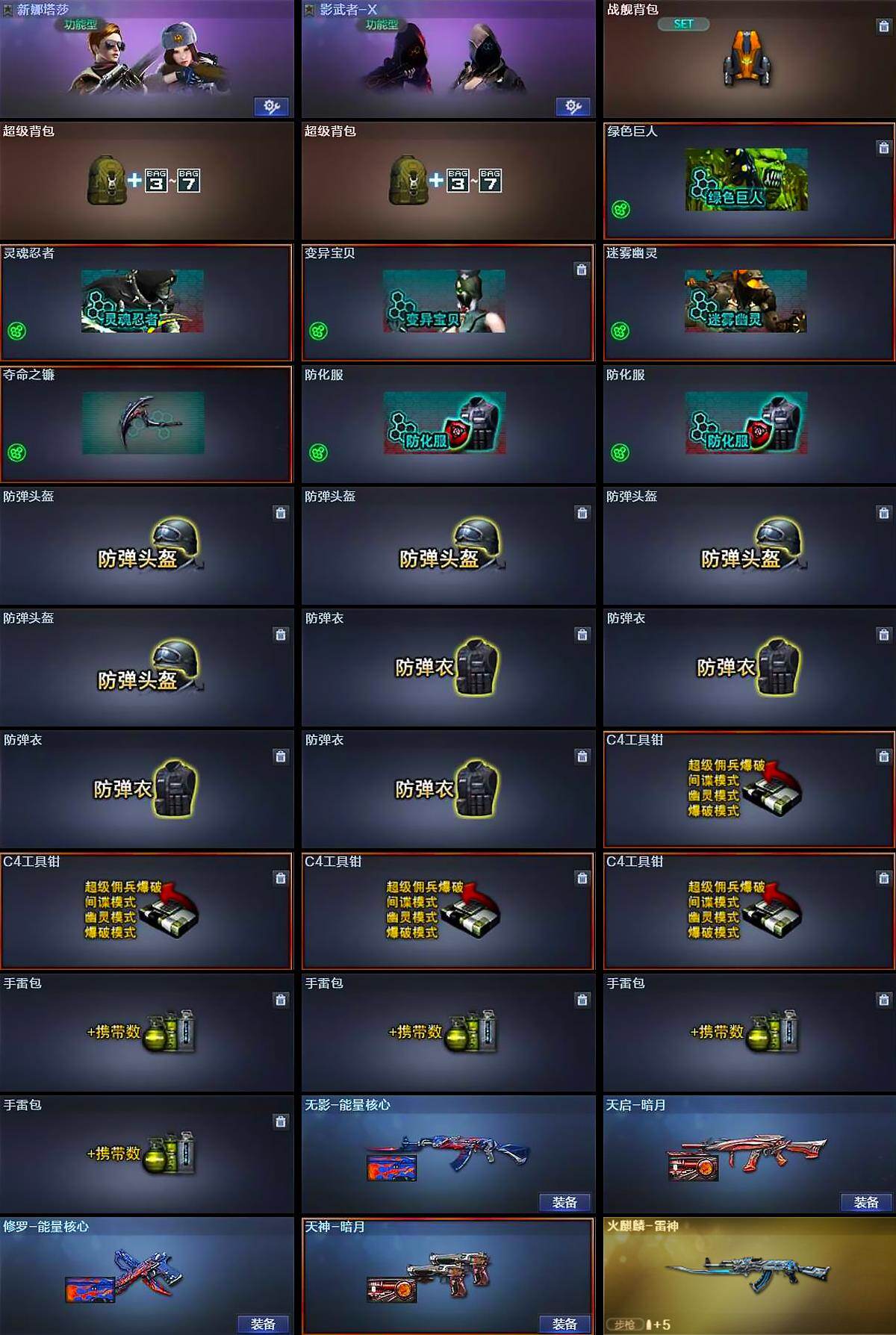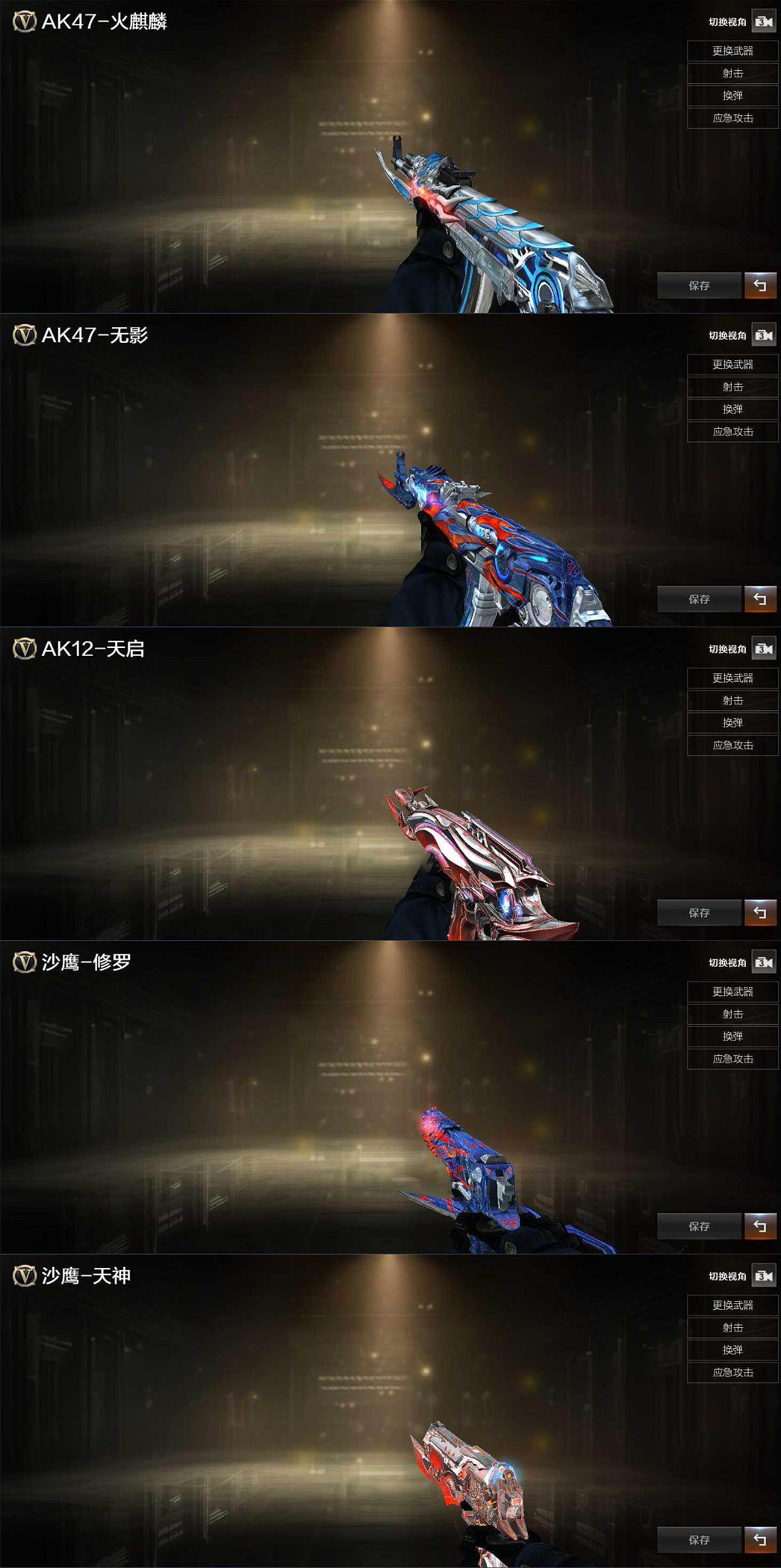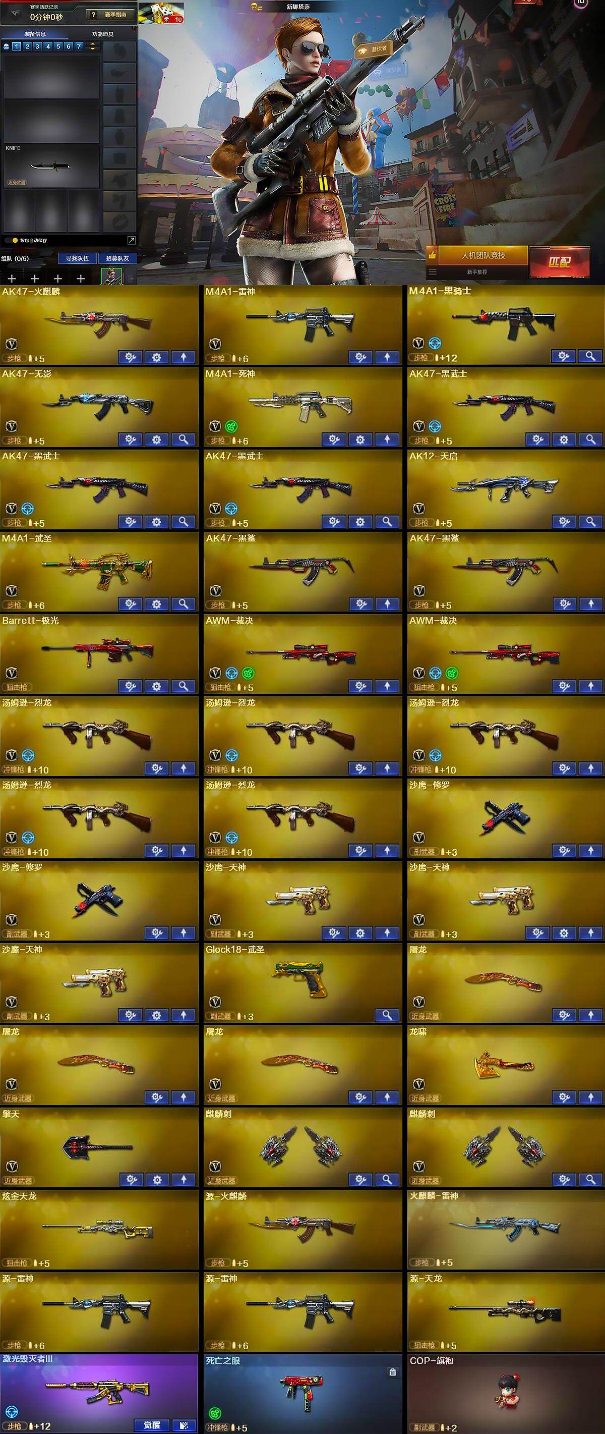 【英雄级武器】:AK47-火麒麟,M4A1-雷神,M4A1-黑骑士,AK47-无影,M4A1-死神,AK47-黑武士*3,AK12-天启,M4A1-武圣