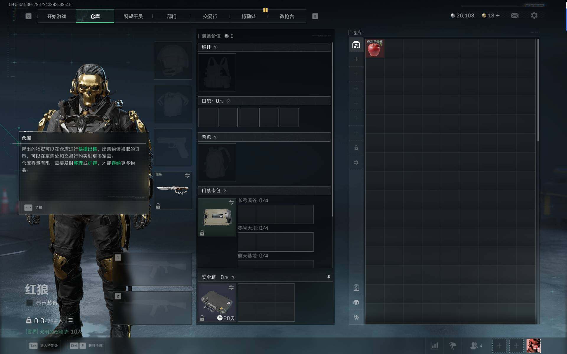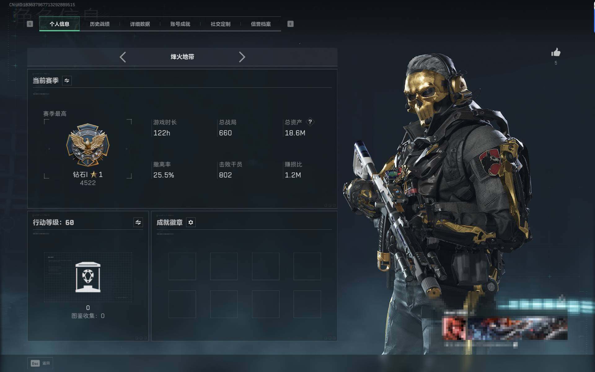 总资产(M):18M/哈夫币(K):26K/传说枪皮数:6/全面战场等级:1_段位:无段位/烽火地带等级:60_段位:钻石/