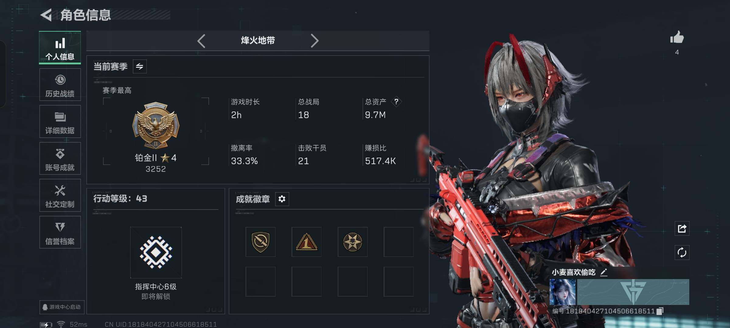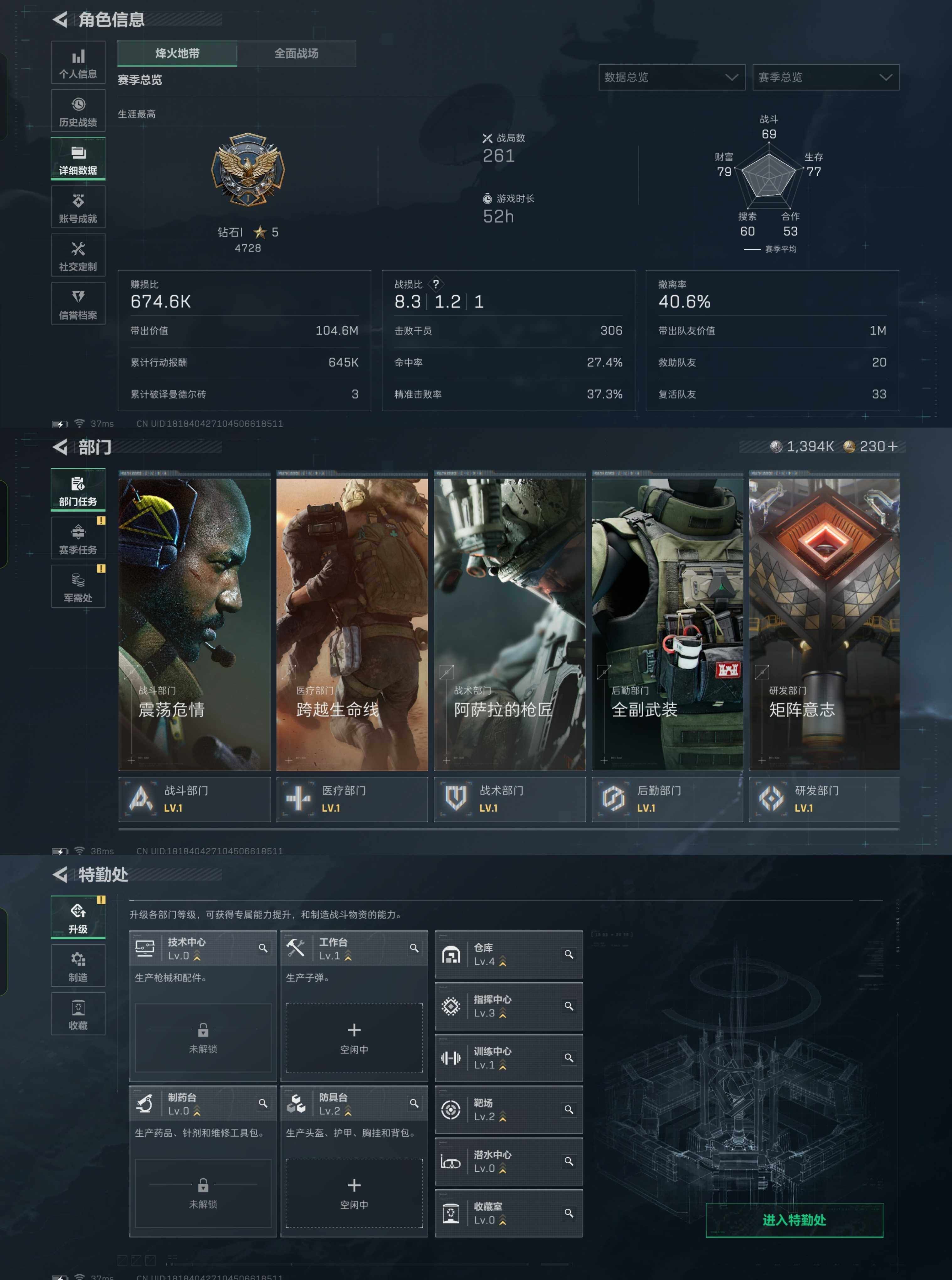 z74,骇爪红皮,三端互通烽火43级,总资产9.7M,6橙枪,黑鹰匕首,图灵砖*16,仓库4级训练中心1级靶场2级
