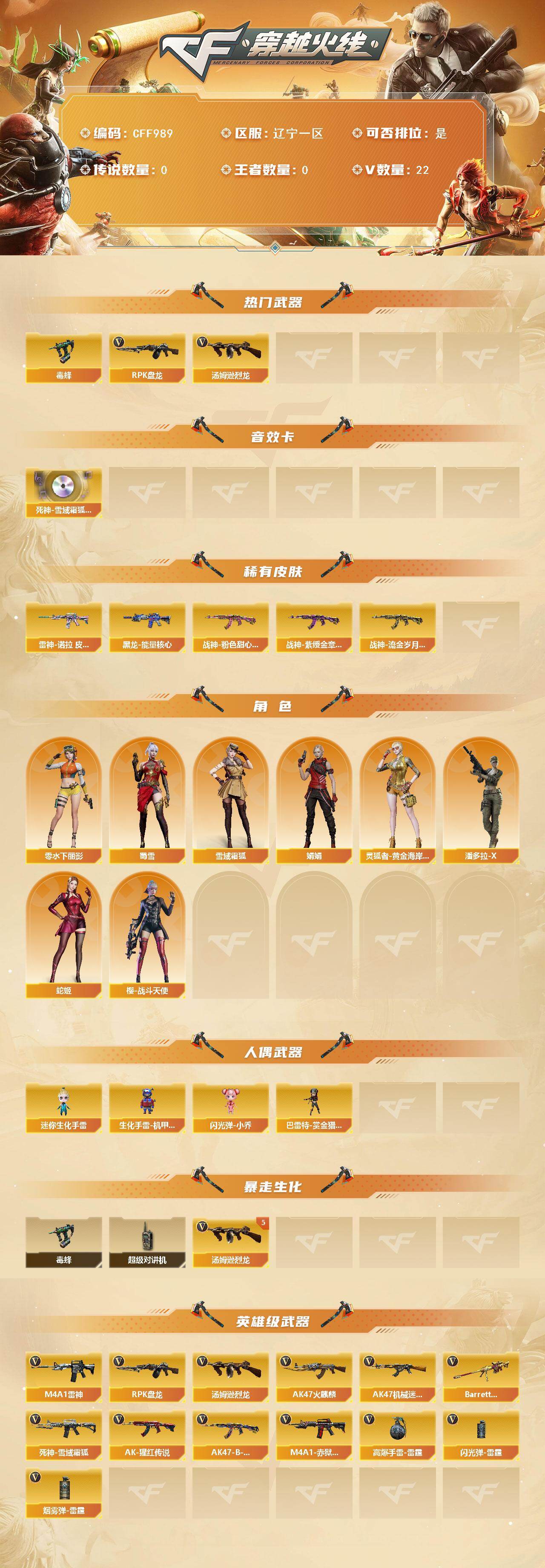 【CFF989】22V/72级/校官/毒蜂/汤姆逊烈龙/RPK_盘龙/死神-雪域霜狐-怀旧音效卡/雷神-诺拉 皮肤/黑龙-能量核心/战神-粉色甜心皮肤/战神-紫绶金章皮肤/战神-流金岁月皮肤/雪域霜狐/娟娟/零-水下丽影/灵狐者-黄金海岸/潘多拉-X/蛇姬/蜀雪/樱-战斗天使/迷你生化手雷/生化手雷-机甲核心/闪光弹-小乔/巴雷特-赏金猎人/超级对讲机/5烈龙/AK47火麒麟/M4A1_雷神/AK47-机械迷城/死神-雪域霜狐/AK-47-猩红传说/AK47-B-战神/Barrett朱雀/高爆手