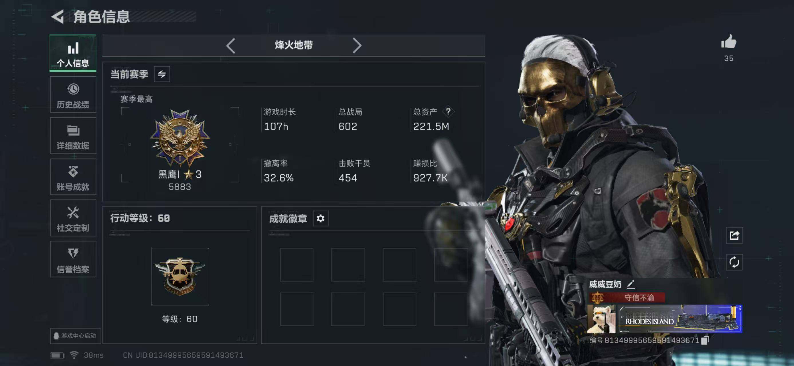 LJ3332总资产221.5M哈弗币8132k近战武器-影锋露娜黑天际线,红狼蚀金玫瑰,威龙壮志凌云,无名夜鹰,蜂医送葬人无题密令无无AW子弹4三角币241仓库LV.8S7顶级安全箱靶场LV.6训练中心LV.6无,露娜-黑·天际线,红狼-蚀金玫瑰,威龙-壮志凌云,无名-夜鹰,蜂医-送葬人·无题密令,近战-影锋