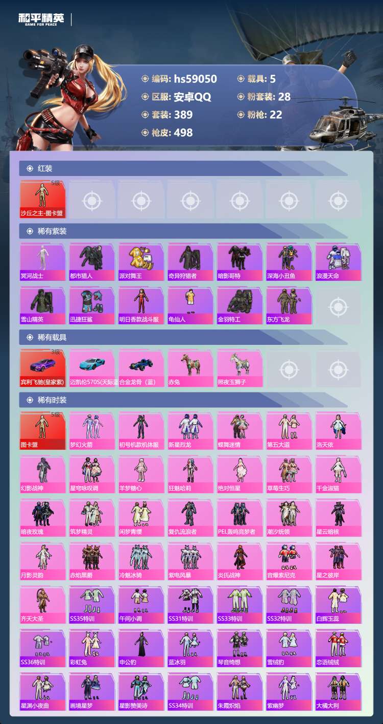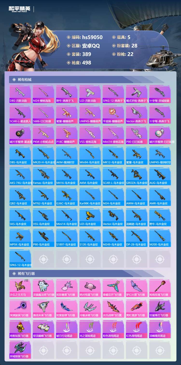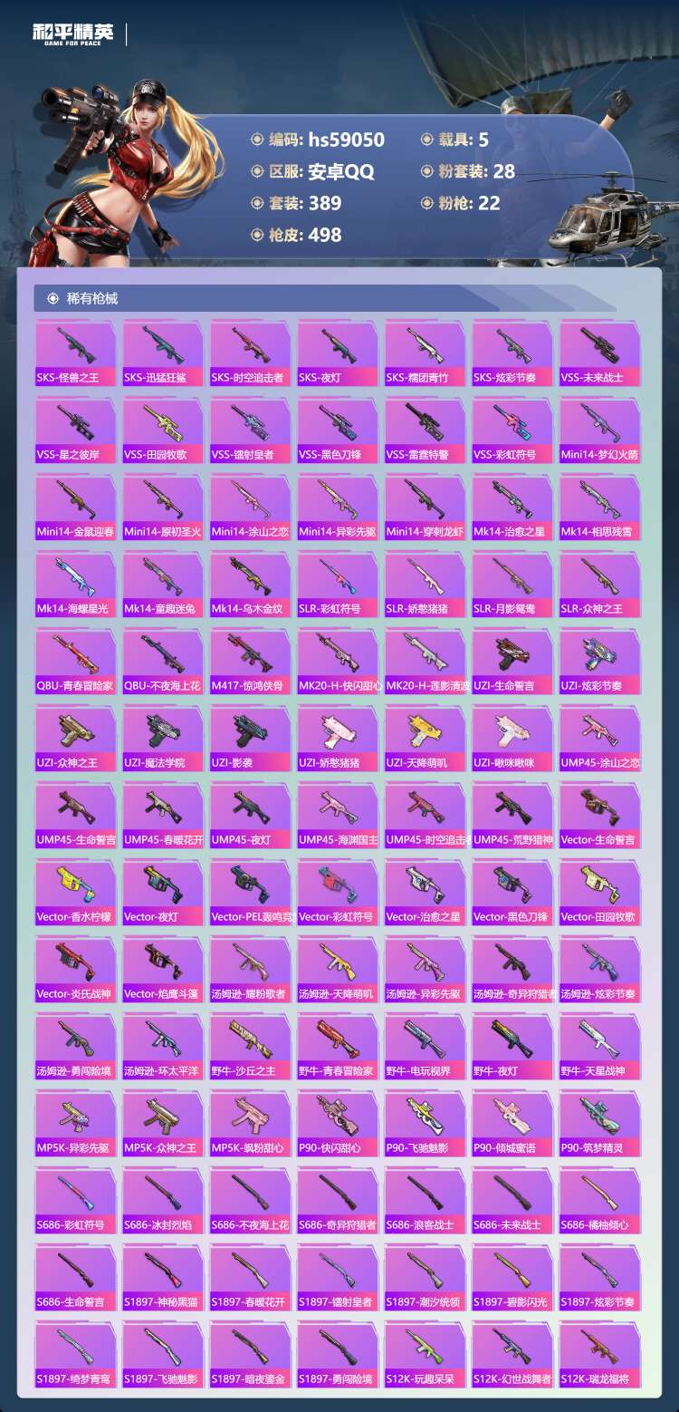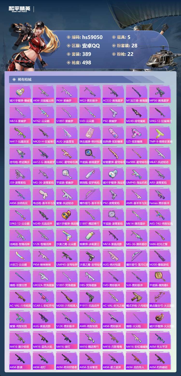 hs59050 安卓手Q-21王牌印记-1红装-28粉装-22特效枪-5载具-206385热力值-3