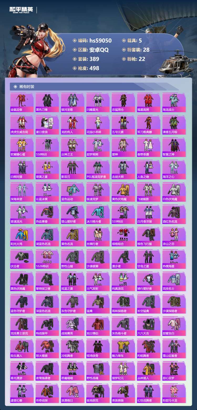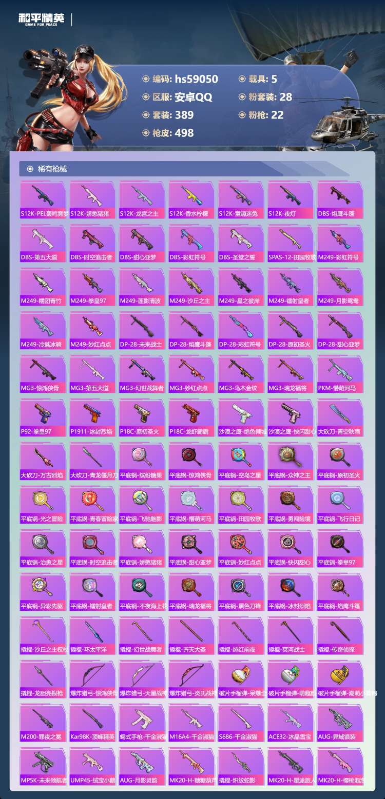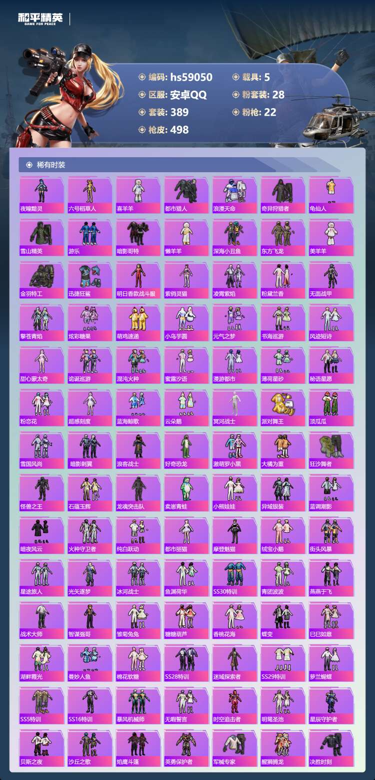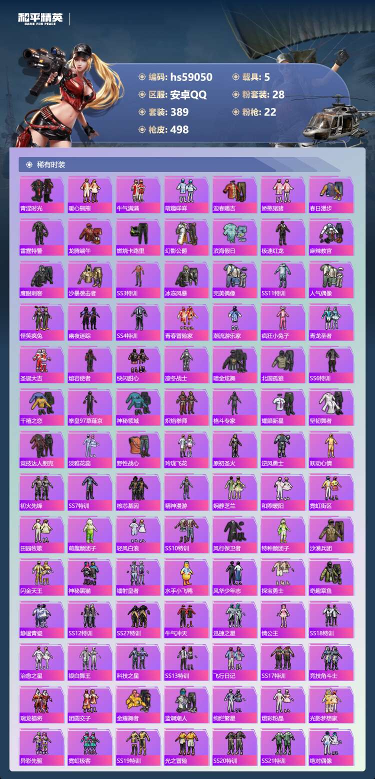 hs59050 安卓手Q-21王牌印记-1红装-28粉装-22特效枪-5载具-206385热力值-3
