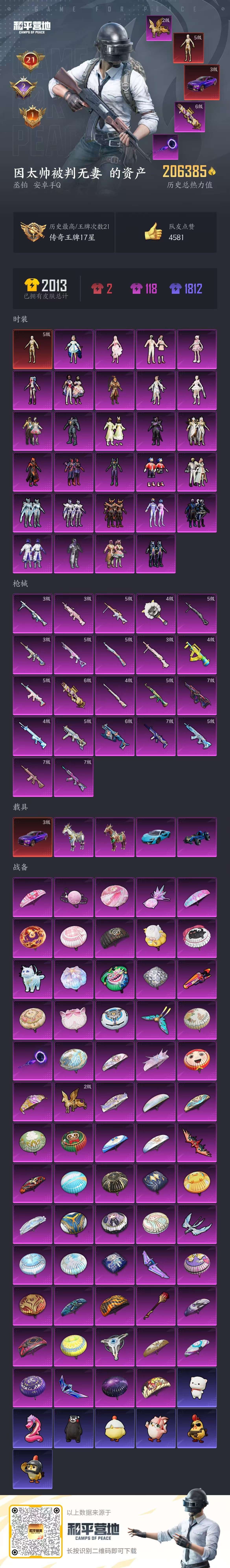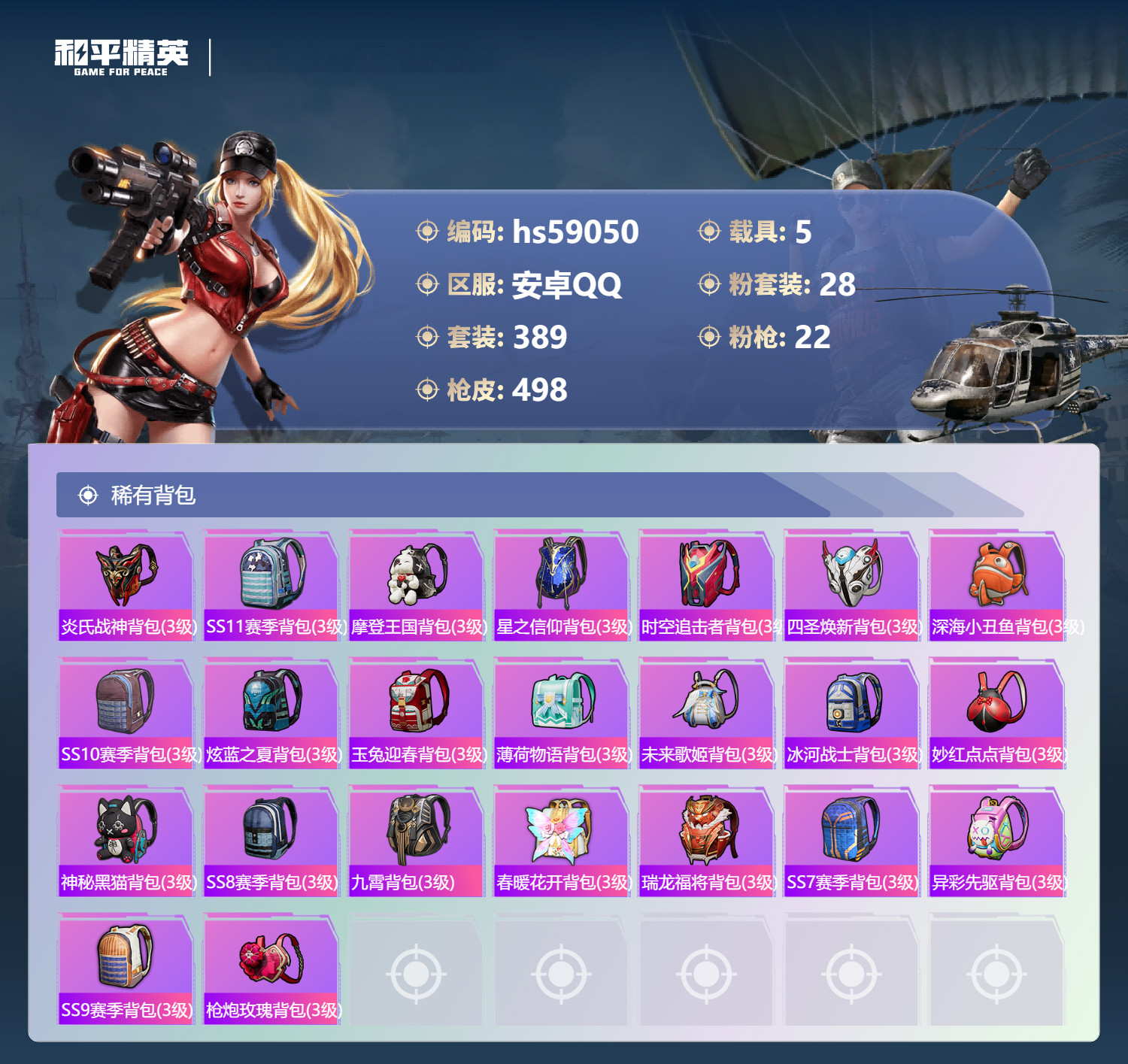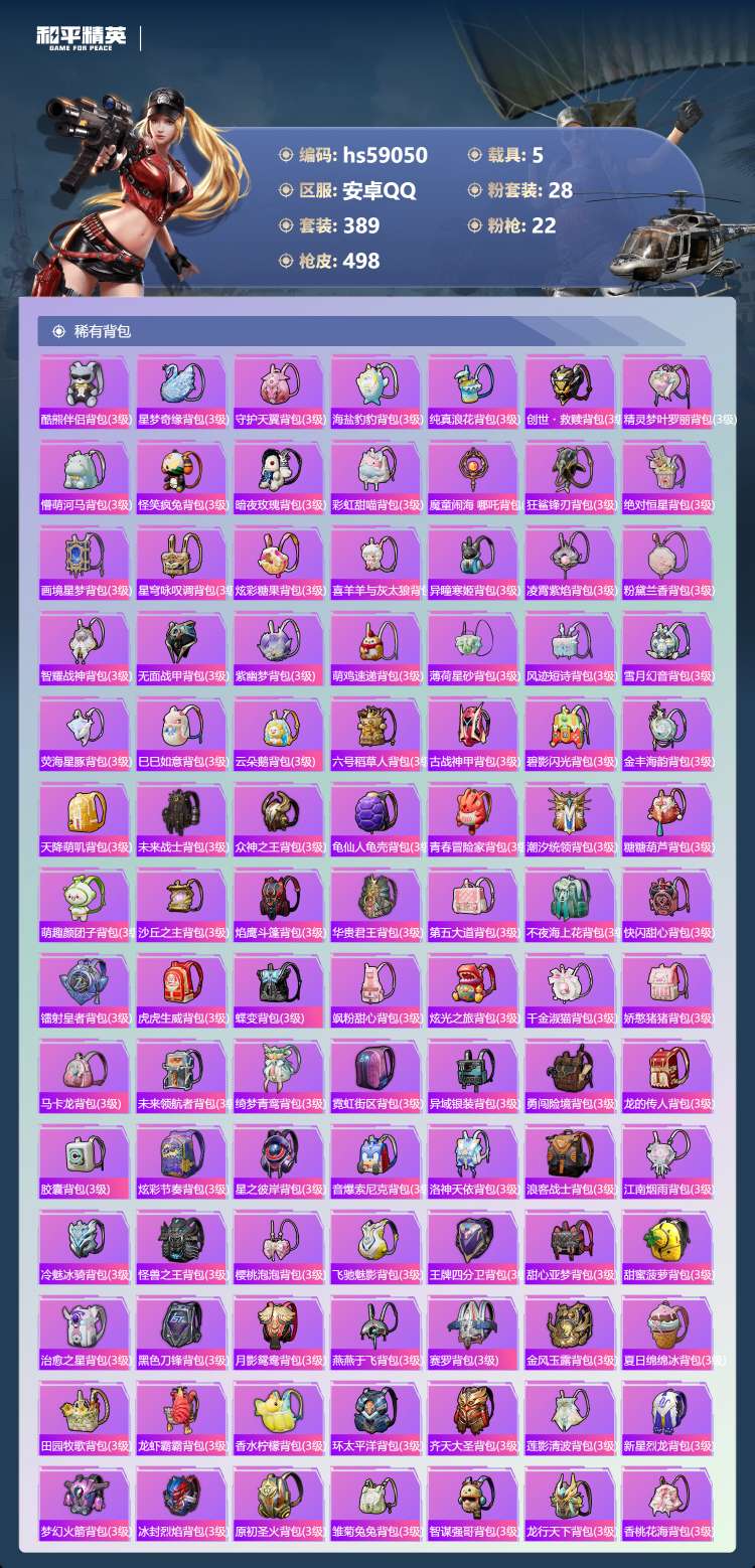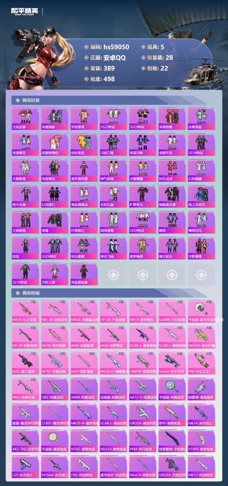 hs59050 安卓手Q-21王牌印记-1红装-28粉装-22特效枪-5载具-206385热力值-3