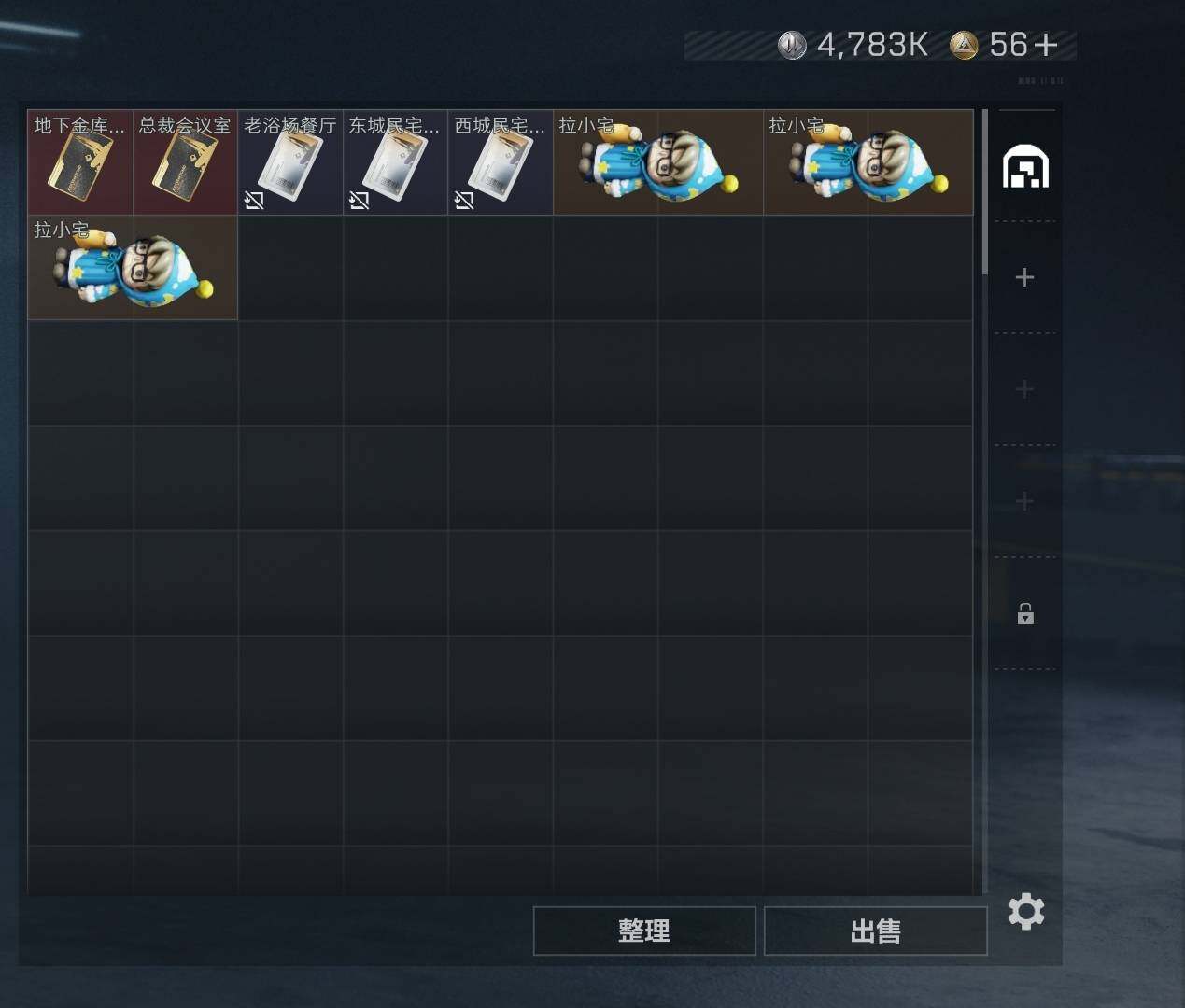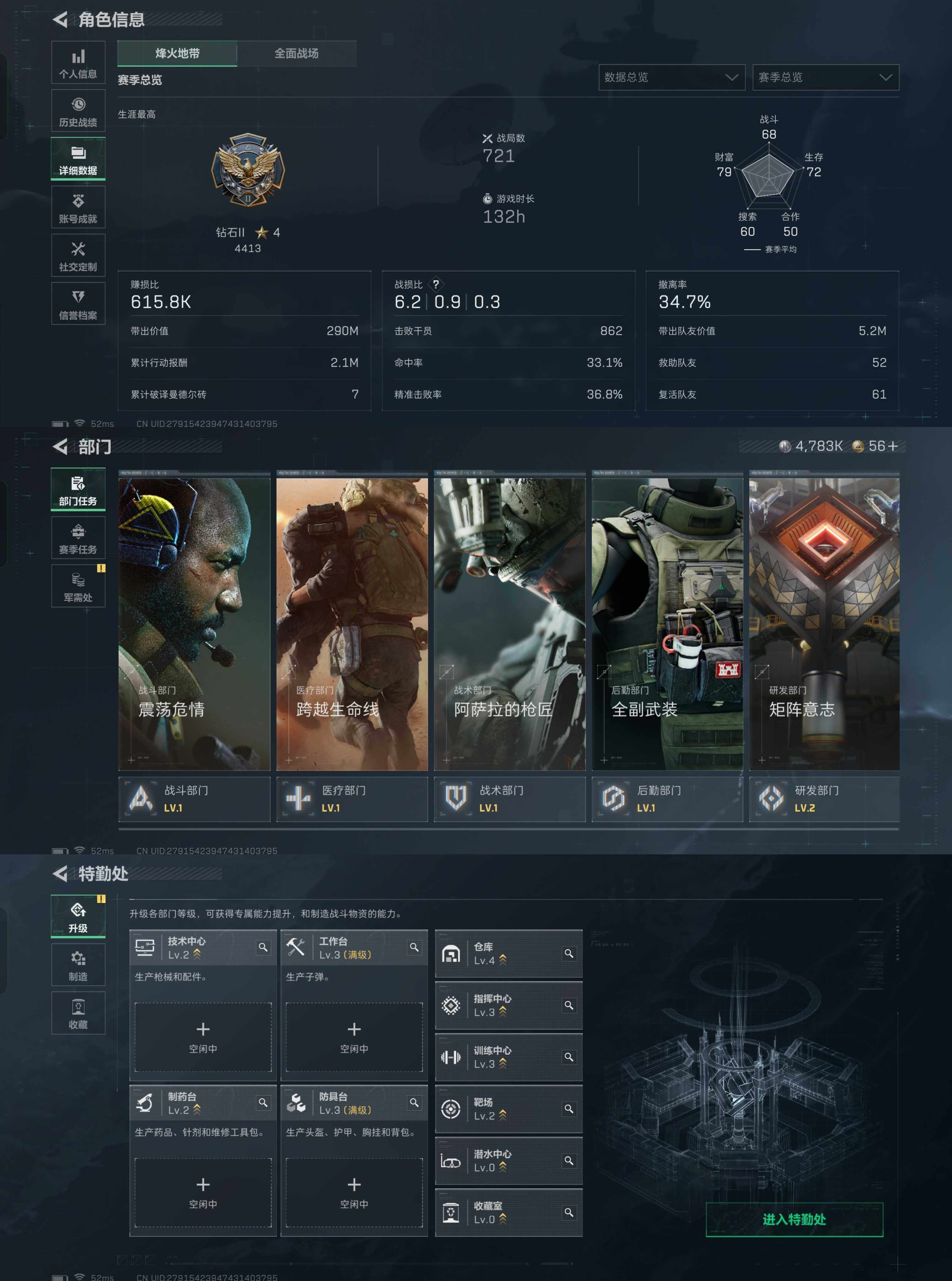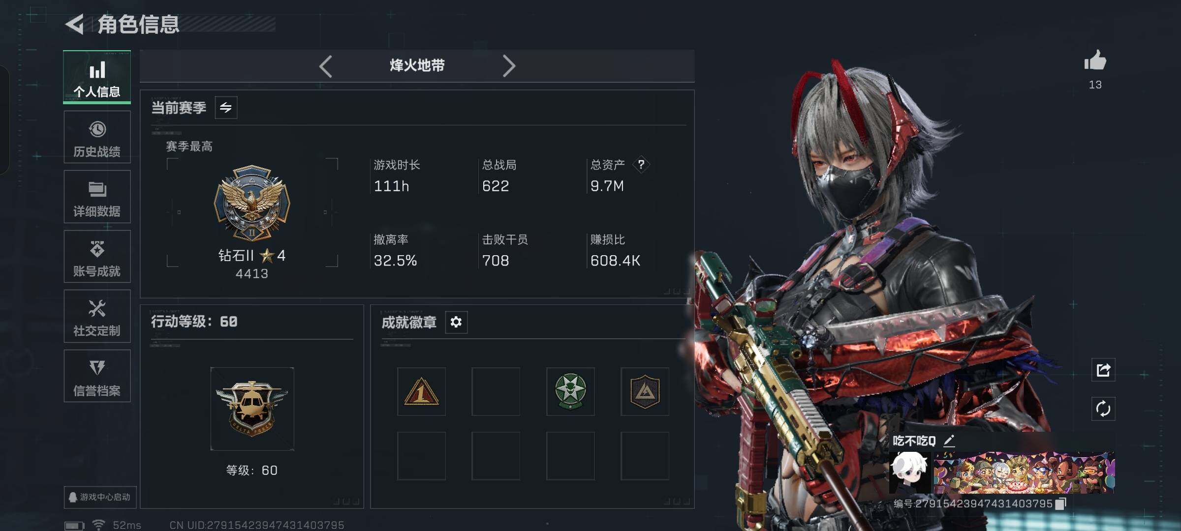 aa13,送王者,皮肤骇爪红皮戴尔,三端互通烽火满级,总资产9.7M,5橙枪,5金吊饰,仓库4级训练中心3级靶场2级