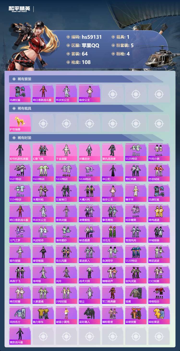 hs59131 苹果手Q-7王牌印记-5粉装-4特效枪-1载具-35693热力值-64套装-108枪