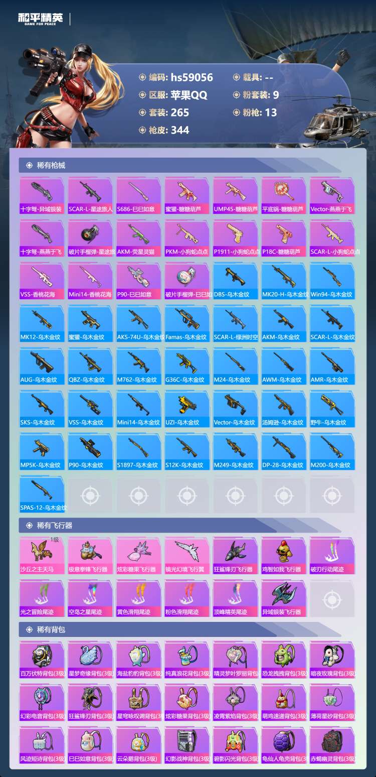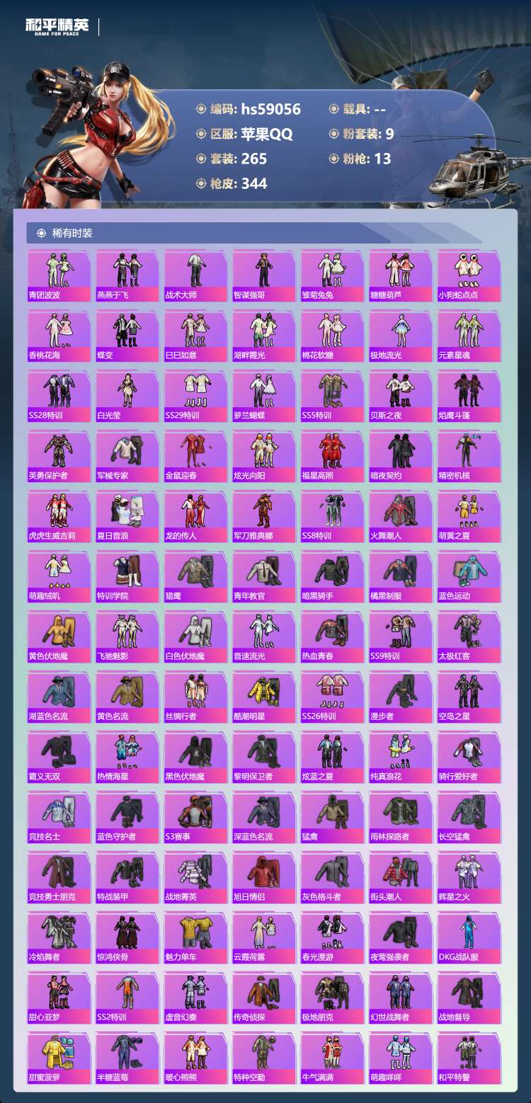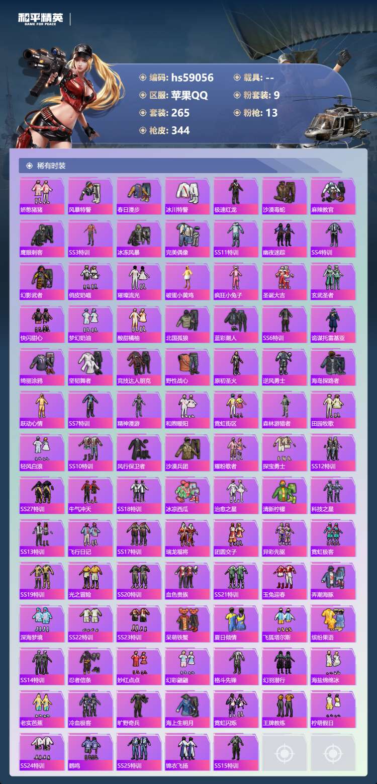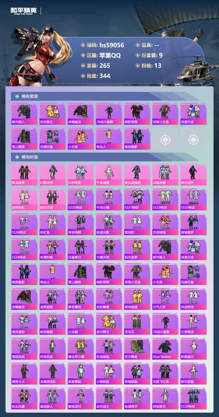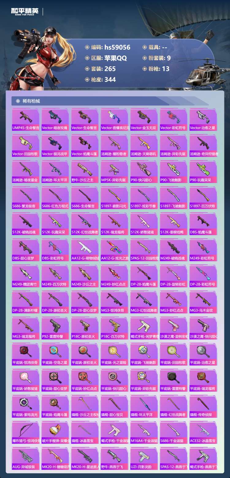 hs59056 苹果手Q-21王牌印记-有战神框-9粉装-13特效枪-106647热力值-265套装