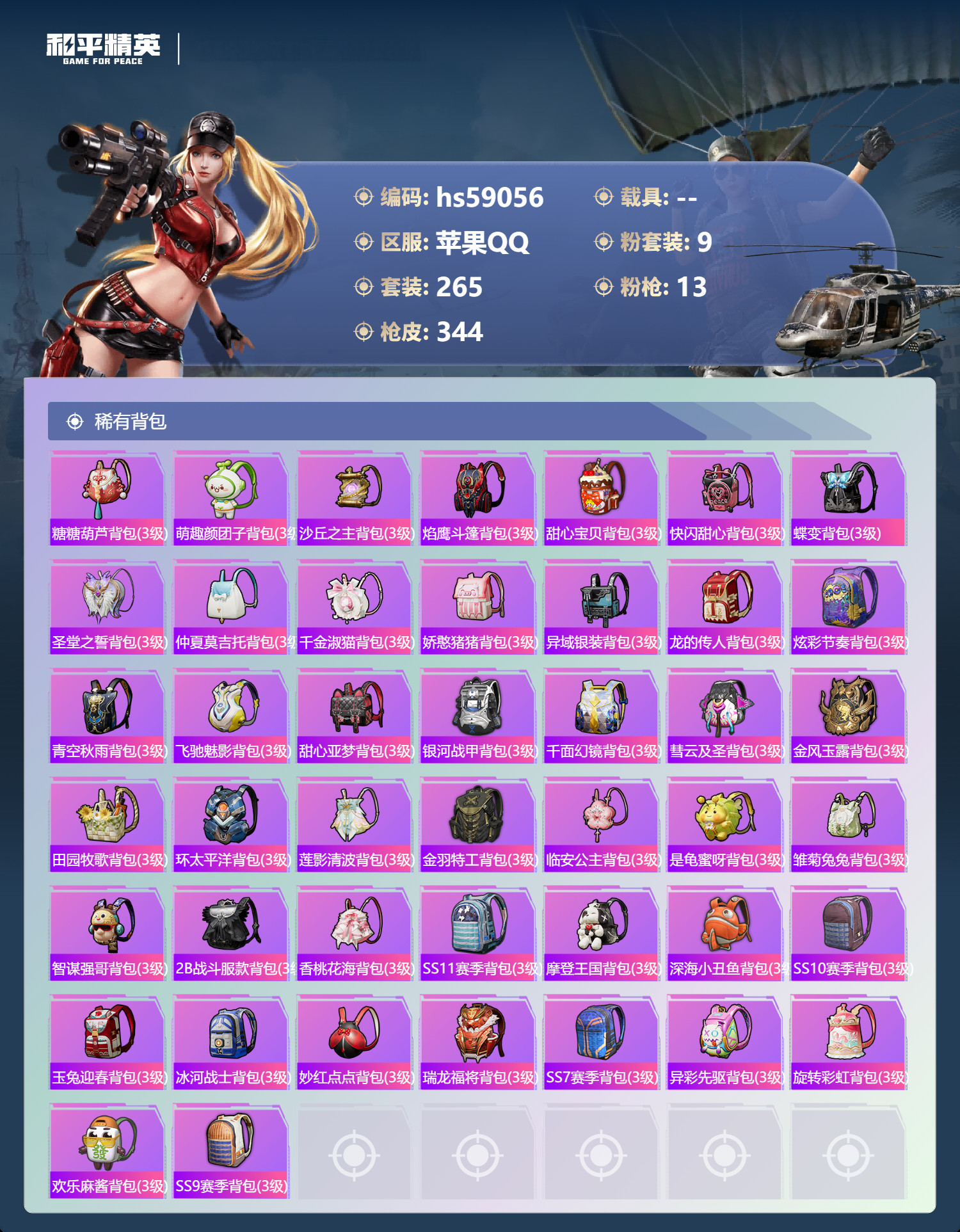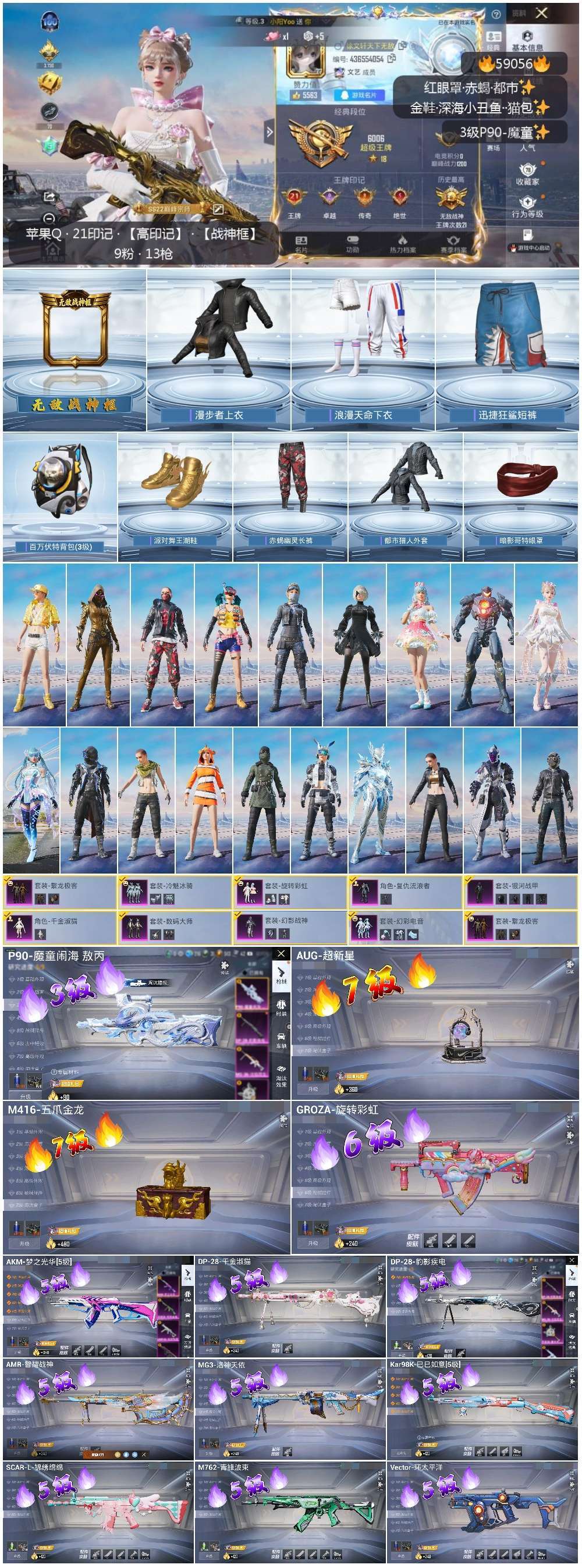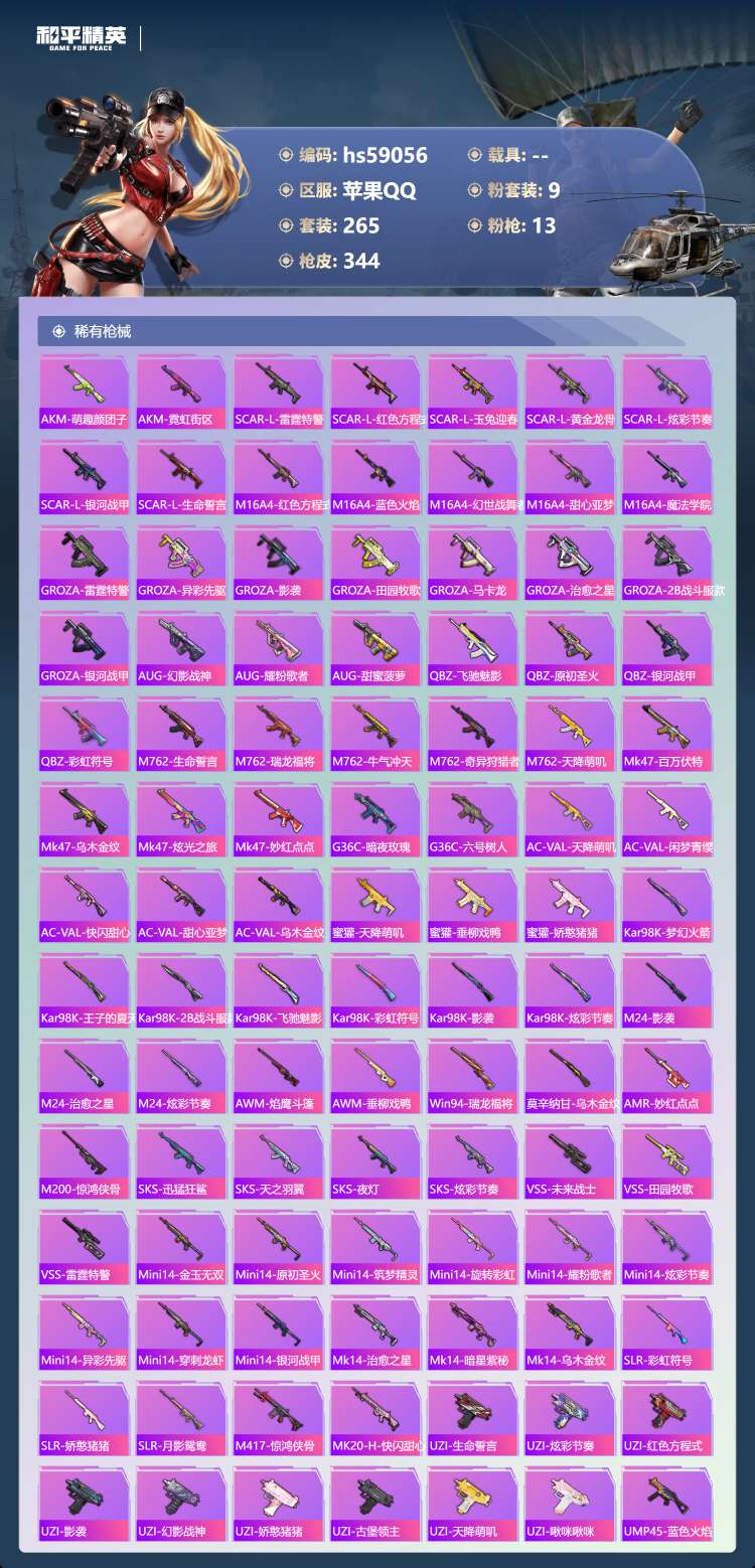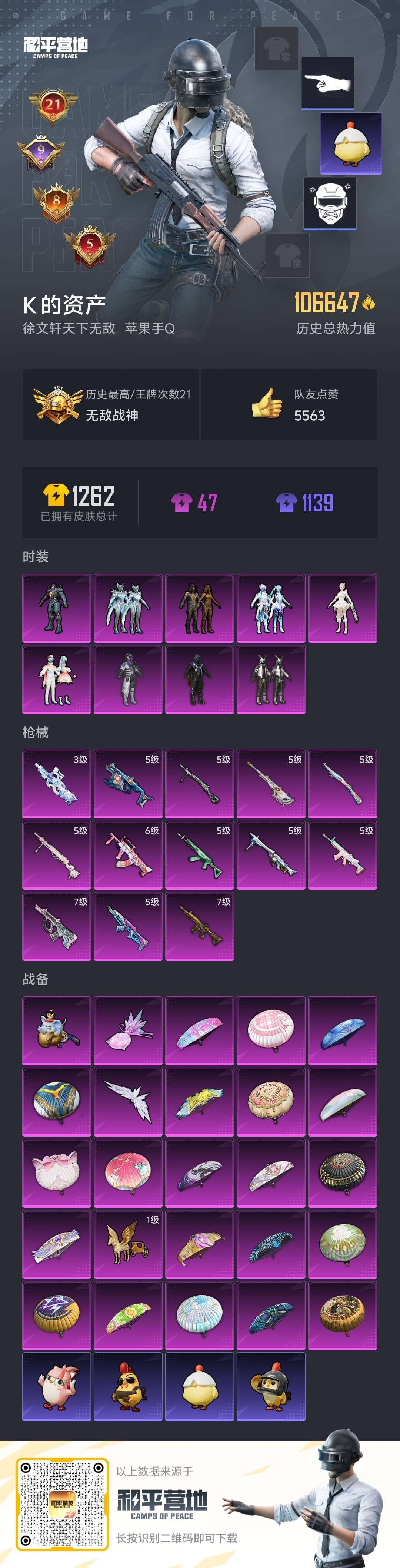 hs59056 苹果手Q-21王牌印记-有战神框-9粉装-13特效枪-106647热力值-265套装