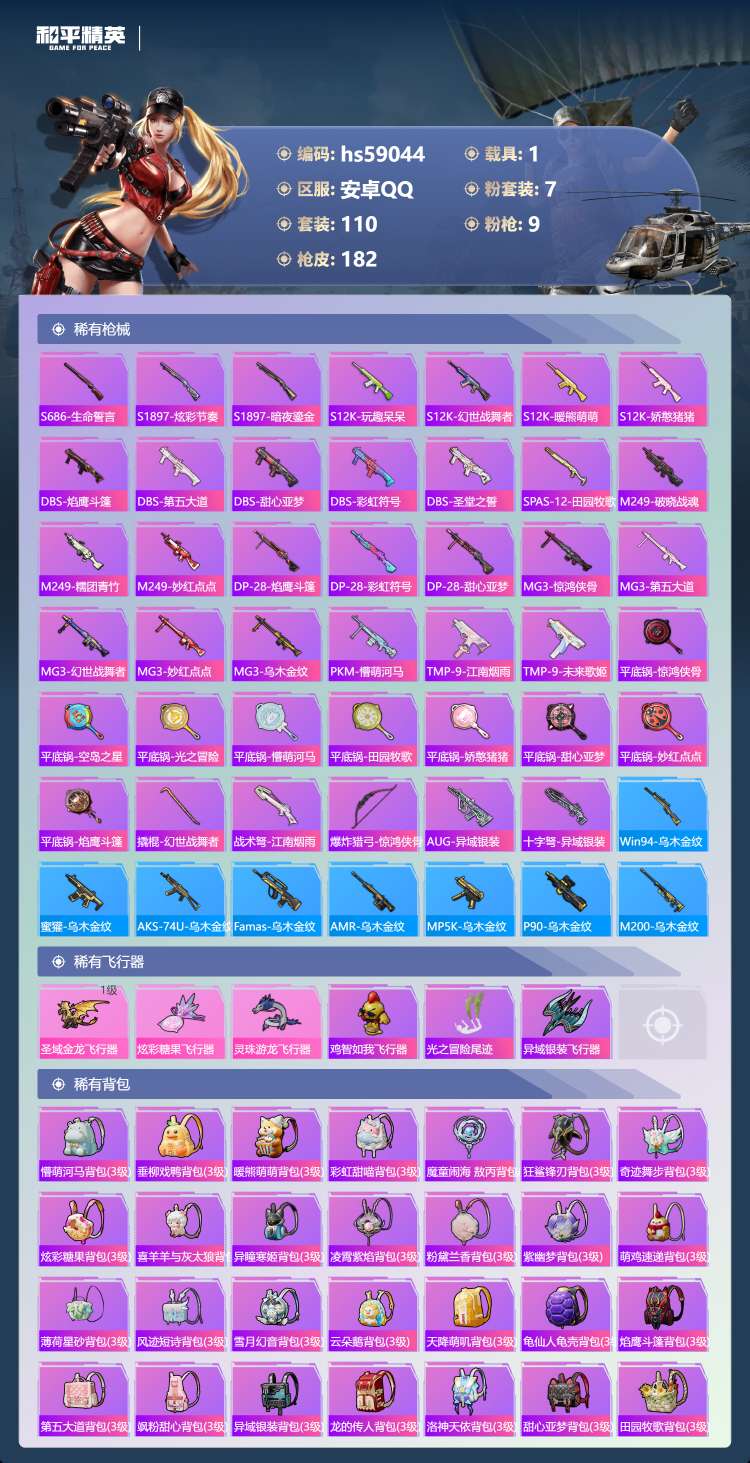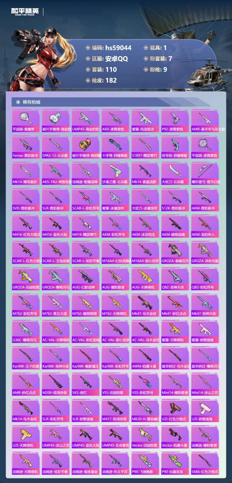 hs59044 安卓手Q-11王牌印记-1红装-7粉装-9特效枪-1载具-60799热力值-110套