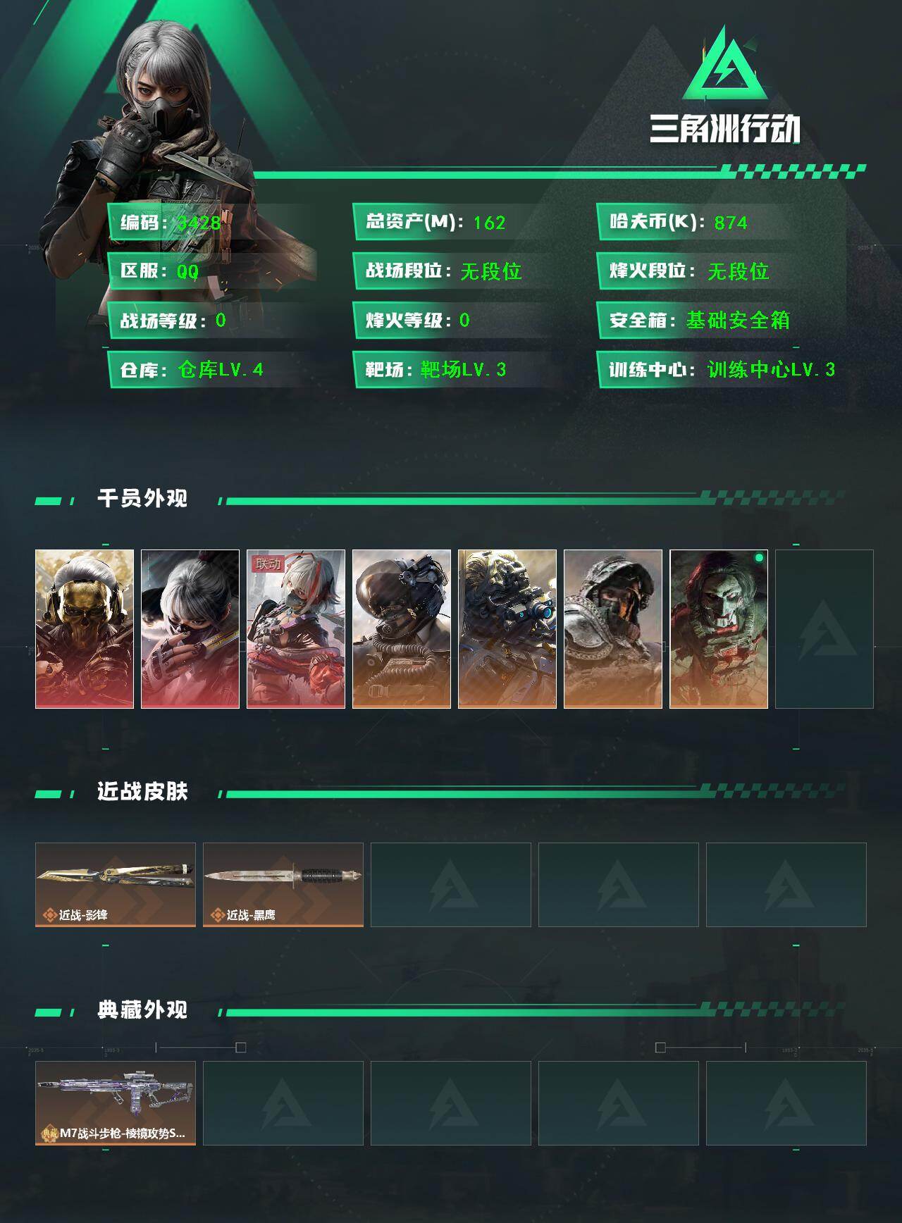 LJ3345总资产161.5m哈弗币874k近战武器-影锋,近战武器-黑鹰骇爪维什戴尔,红狼蚀金玫瑰,骇爪水墨云图,威龙壮志凌云,无名夜鹰,深蓝不破誓约,红狼电锯惊魂M7战斗步枪-棱镜攻势S2(优品C)无AW子弹41三角币724仓库LV.8S7顶级安全箱靶场LV.6训练中心LV.7无,骇爪-维什戴尔,红狼-蚀金玫瑰,骇爪-水墨云图,威龙-壮志凌云,无名-夜鹰,深蓝-不破誓约,红狼-电锯惊魂,近战