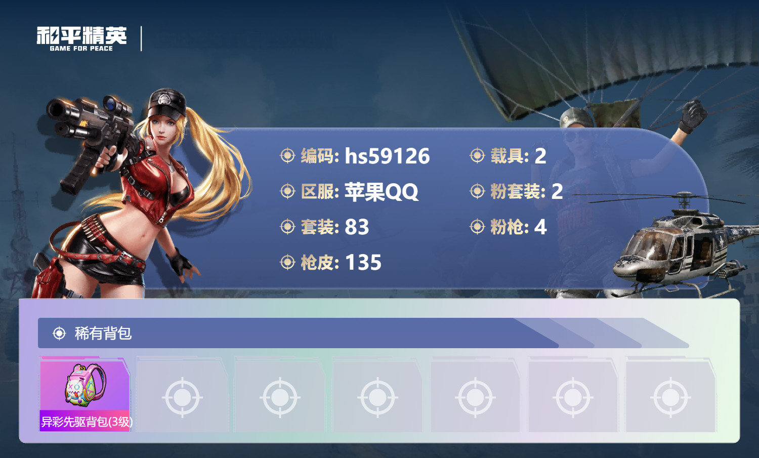 hs59126 苹果手Q-6王牌印记-2粉装-4特效枪-2载具-43234热力值-83套装-135枪
