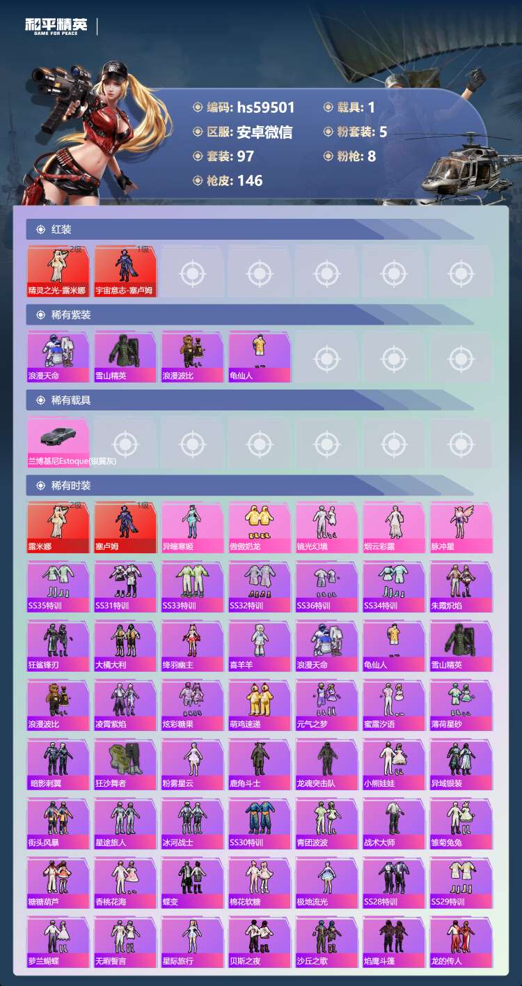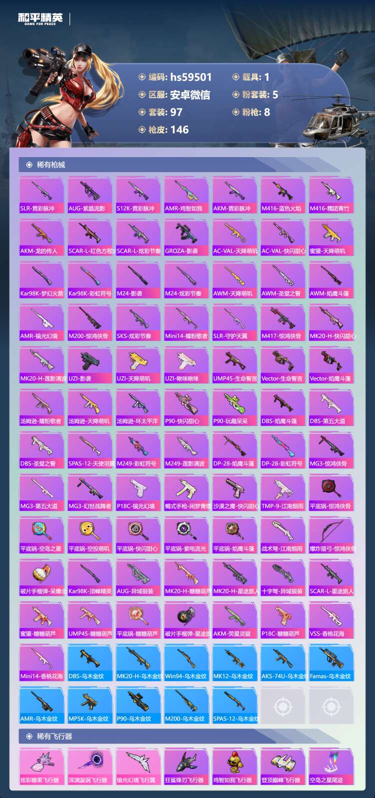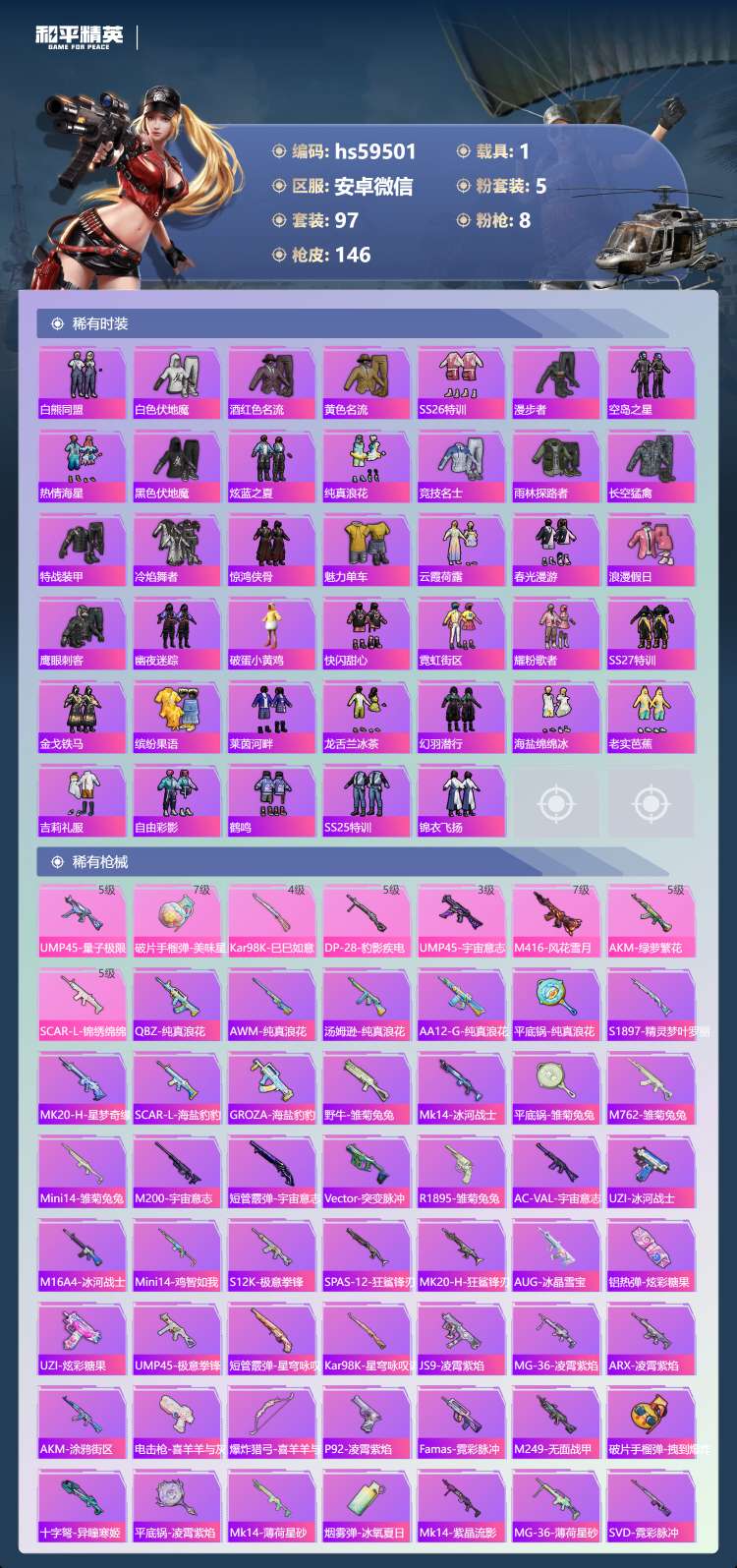 hs59501 安卓微-8王牌印记-2红装-5粉装-8特效枪-1载具-51919热力值-97套装-