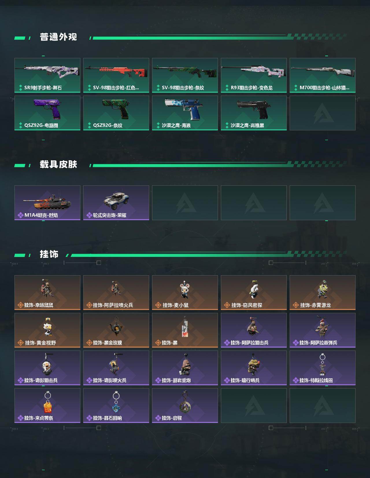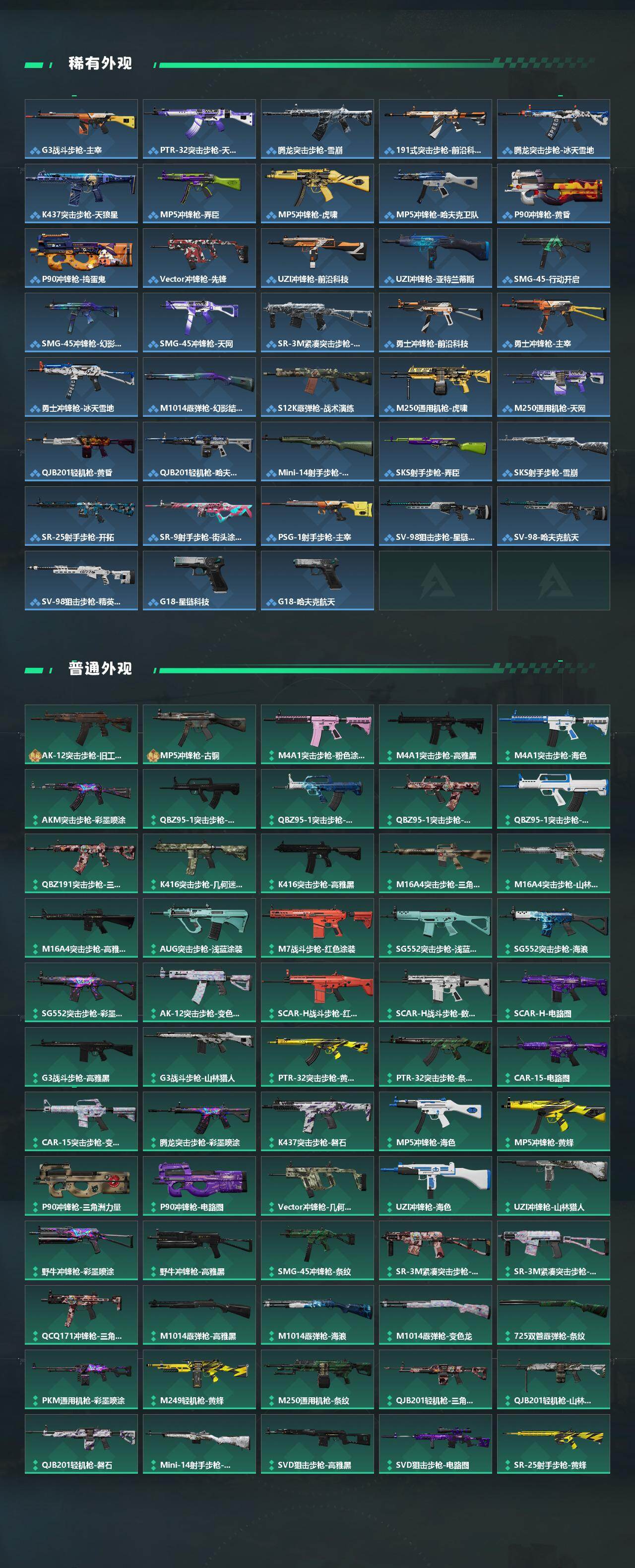 【传说外观】:M4A1突击步枪-蚀金玫瑰,M4A1突击步枪-阿米娅,ASh-12战斗步枪-鹅鸭杀,M7战斗步枪-小肥柴