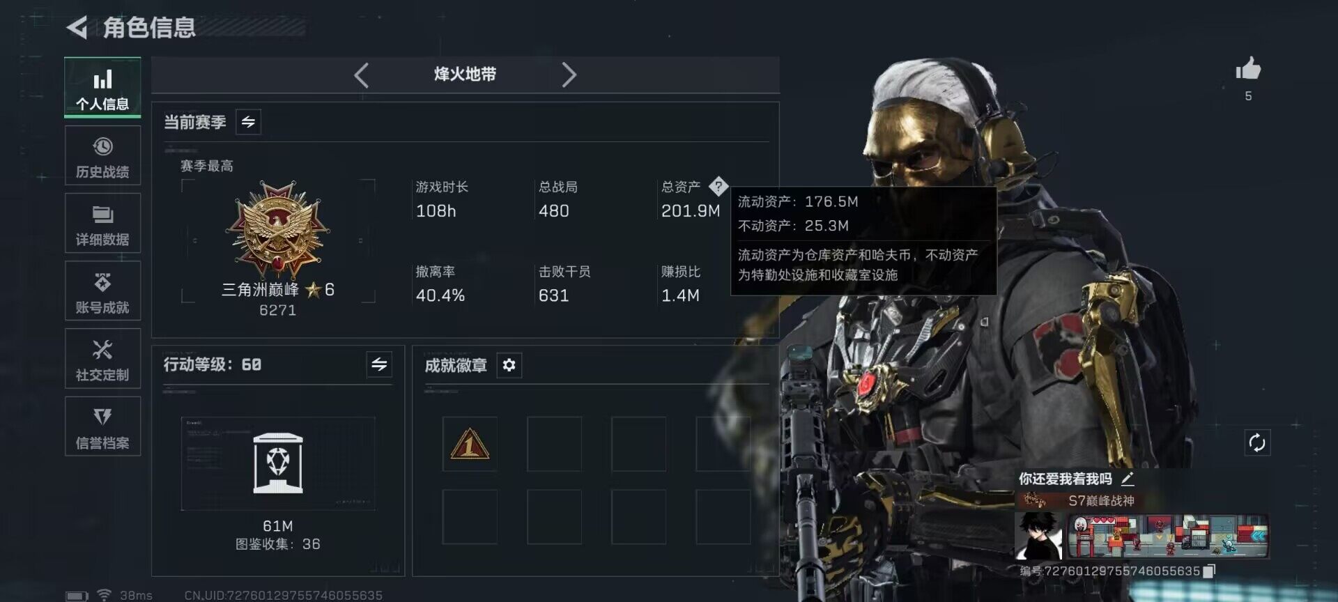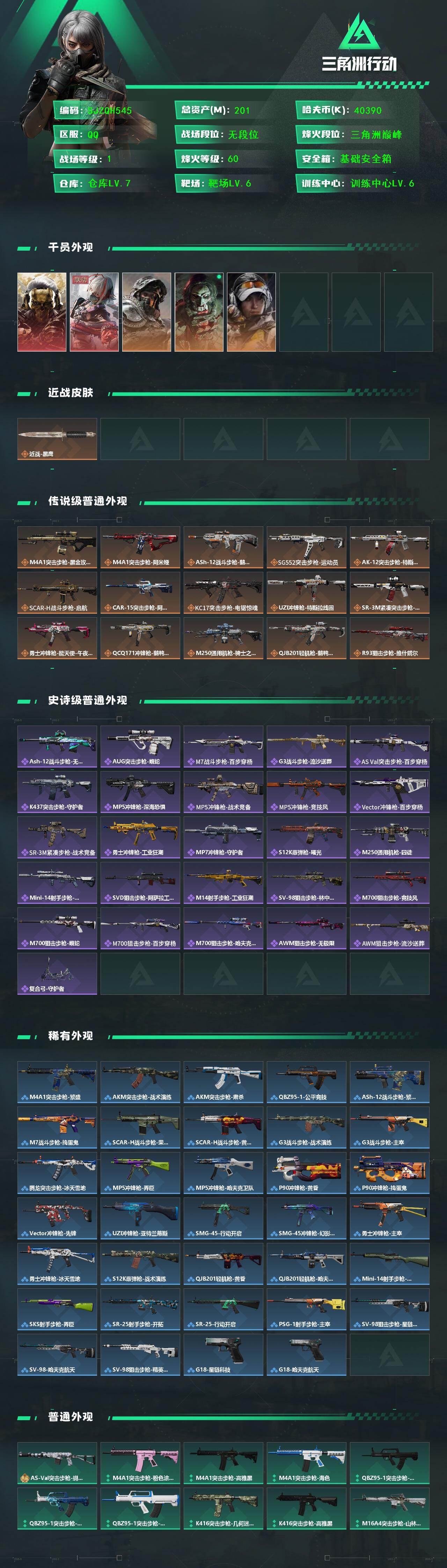 【SJZQH545】总资产(M):201M/哈夫币(K):40390K/哈夫币(K):40390K/传说枪皮数:15/全面战场等级:1_段位:无段位/烽火地带等级:60_段位:三角洲巅峰/红狼-蚀金玫瑰/骇爪-维什戴尔/深蓝-不破誓约/红狼-电锯惊魂/露娜-金牌射手/近战-黑鹰/M4A1突击步枪-蚀金玫瑰/M4A1突击步枪-阿米娅/ASh-12战斗步枪-鹅鸭杀/SG552突击步枪-运动员/AK-12突击步枪-特斯拉线圈/SCAR-H战斗步枪-启航/CAR-15突击步枪-阿米娅/KC17突击步枪-