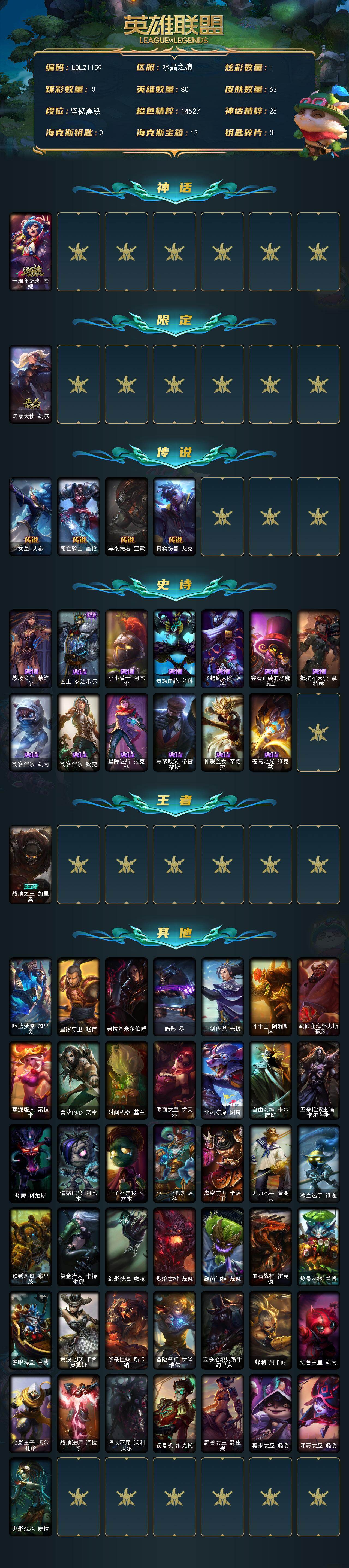 80英雄/63皮肤/1神话/1限定/1炫彩/4传说/13史诗/未定级