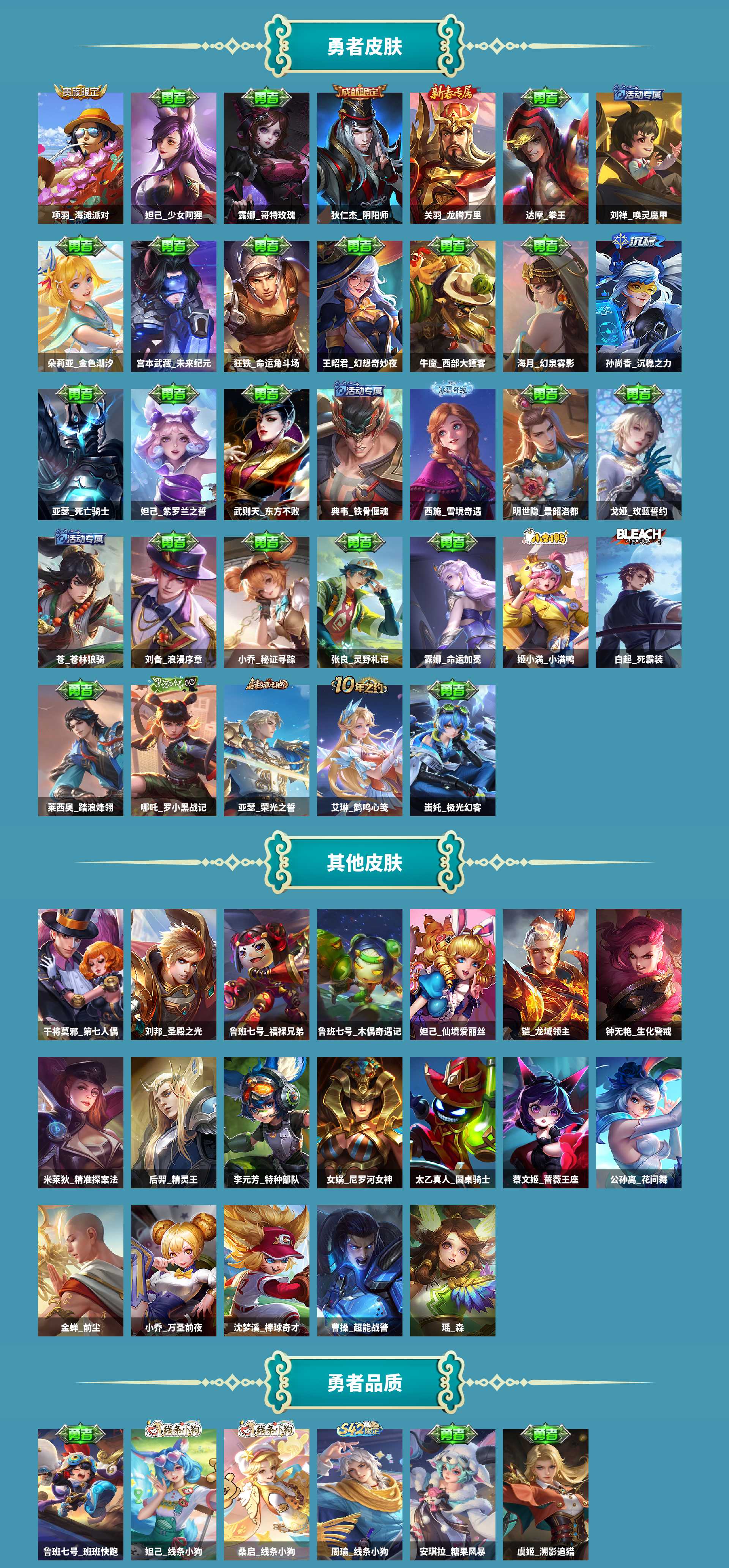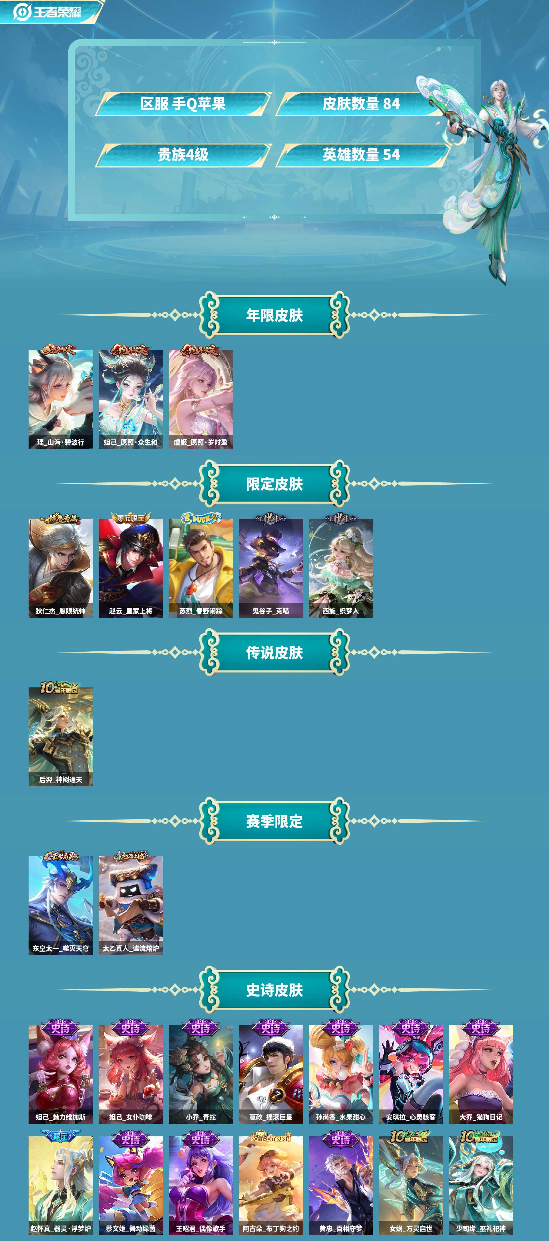 史诗皮肤:赵云皇家上将,嬴政摇滚巨星,安琪拉心灵骇客,少司缘巫礼祀神,小乔青蛇,狄仁杰鹰眼统帅,女娲万灵启世,西施织梦人,瑶山海碧波行,黄忠百相守梦,阿古朵_布丁狗之约,大乔猫狗日记,赵怀真器灵浮梦炉,王昭君偶像歌手,孙