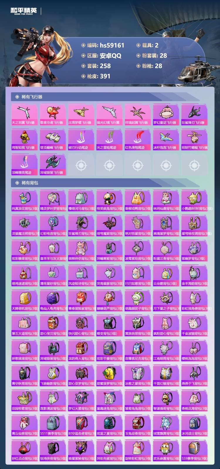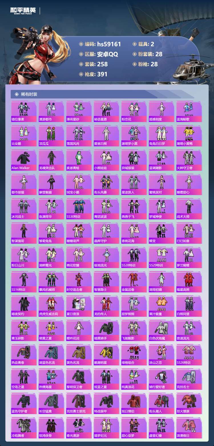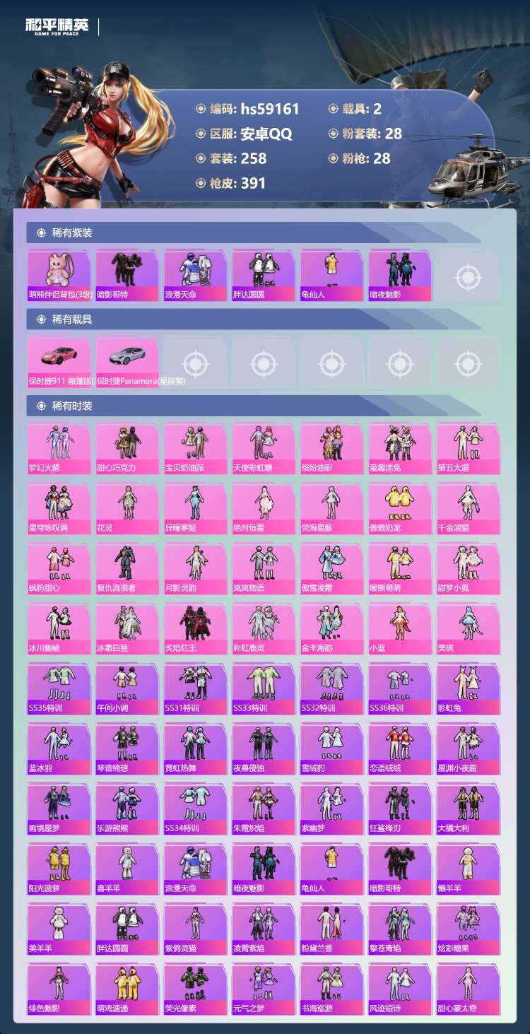 hs59161 安卓手Q-20王牌印记-28粉装-28特效枪-2载具-138888热力值-258套装