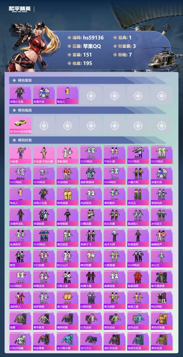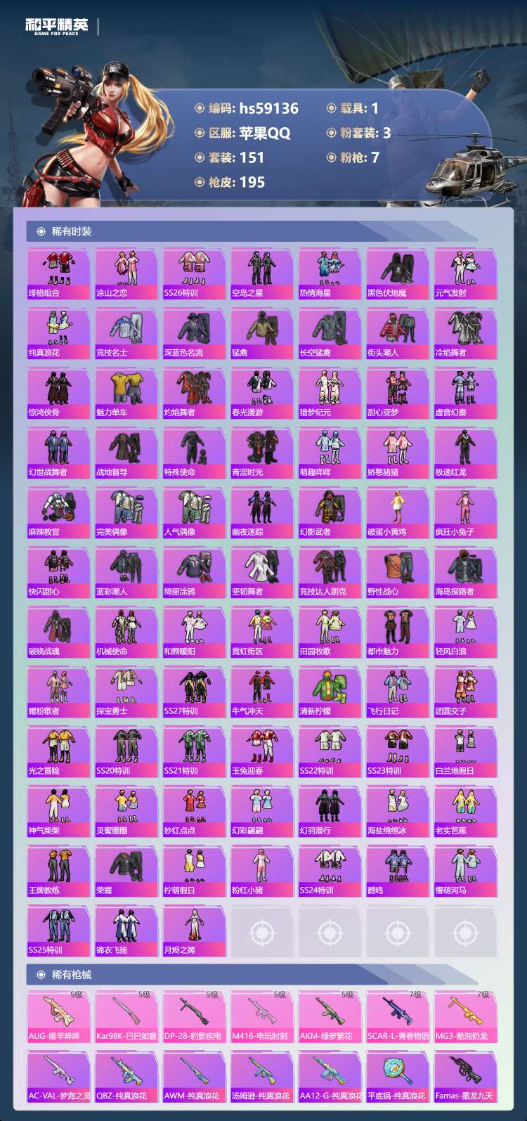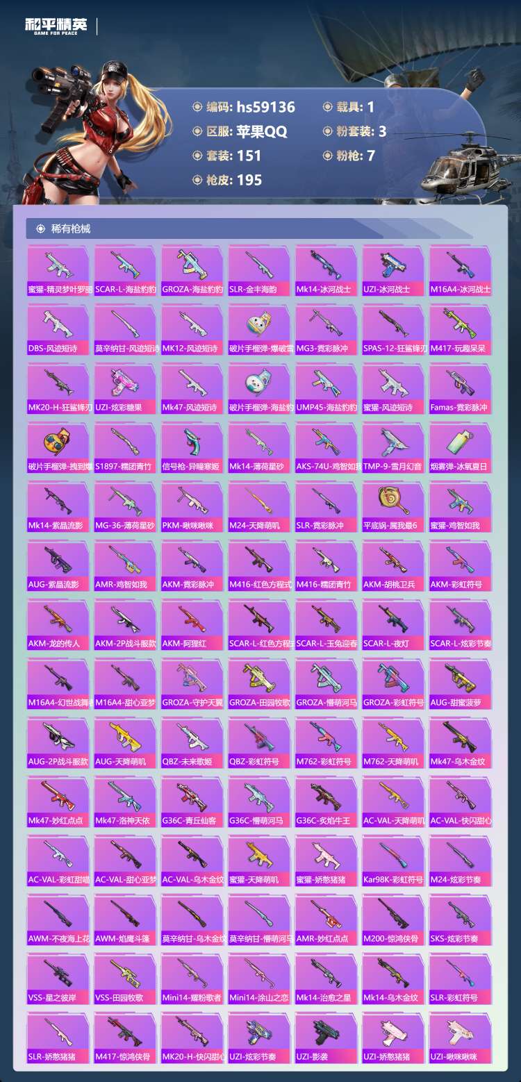 hs59136 苹果手Q-15王牌印记-3粉装-7特效枪-1载具-59294热力值-151套装-19