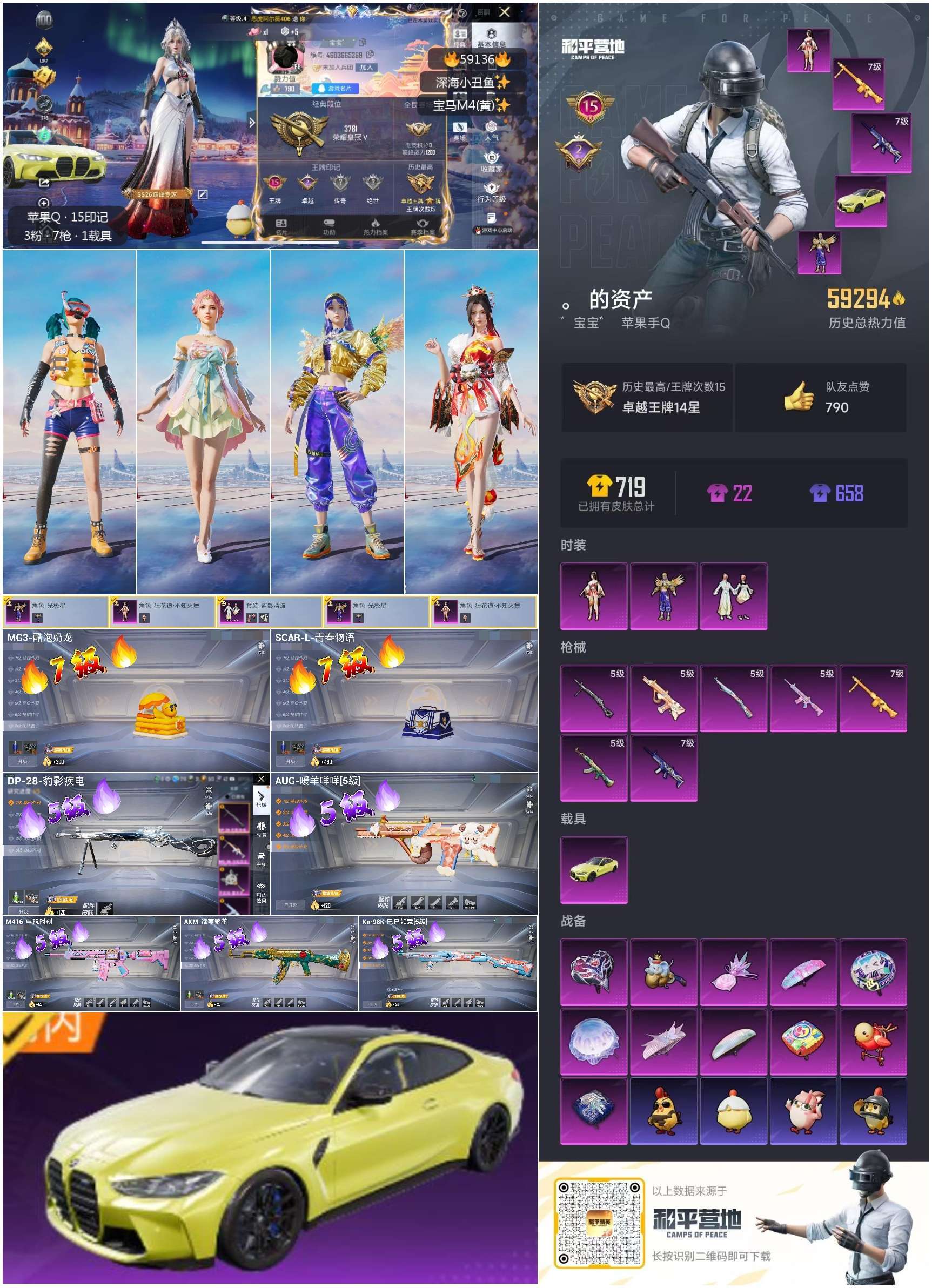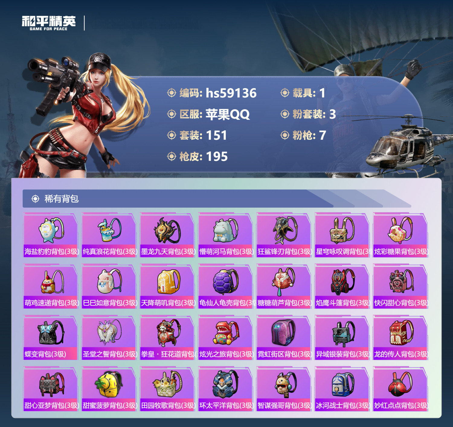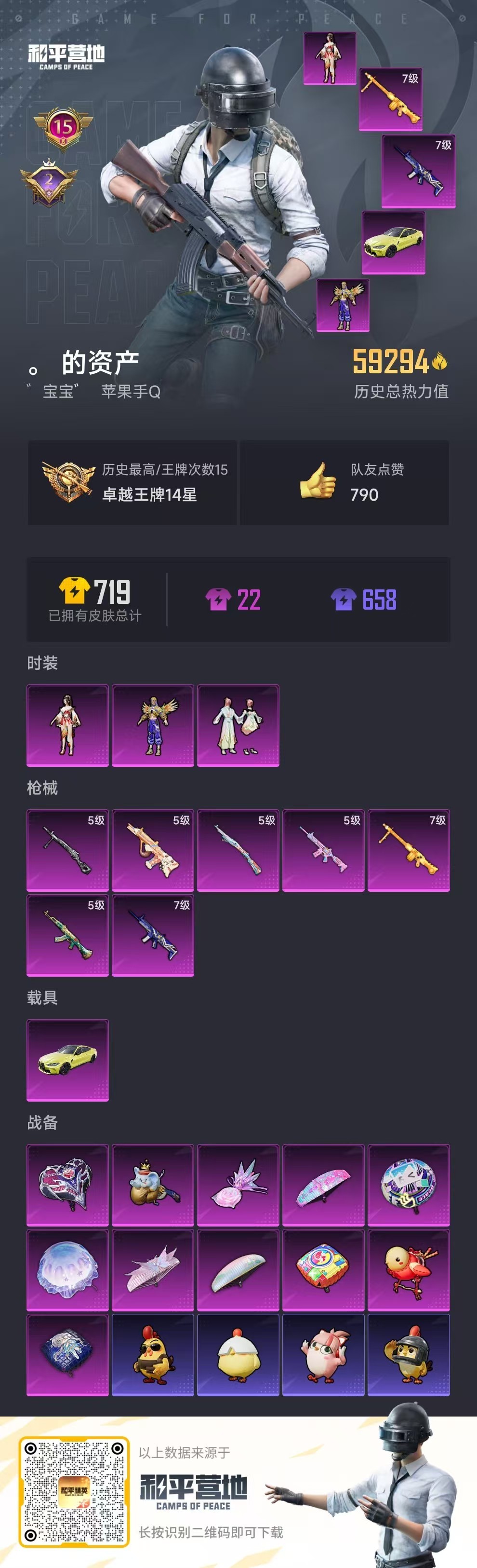 hs59136 苹果手Q-15王牌印记-3粉装-7特效枪-1载具-59294热力值-151套装-19
