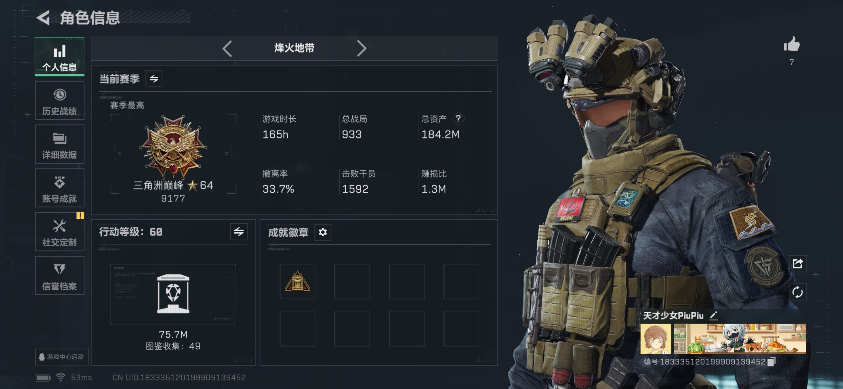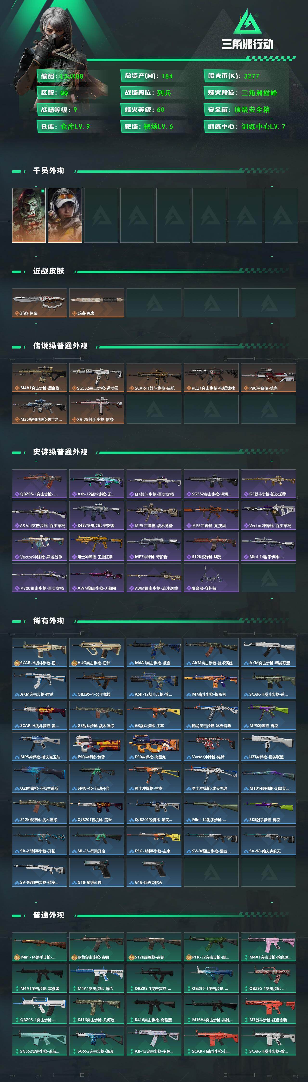 【特价出售/店主推荐】 184m总资产-3277k哈伏币-60烽火等级-三角洲巅峰-9战场等级-列兵