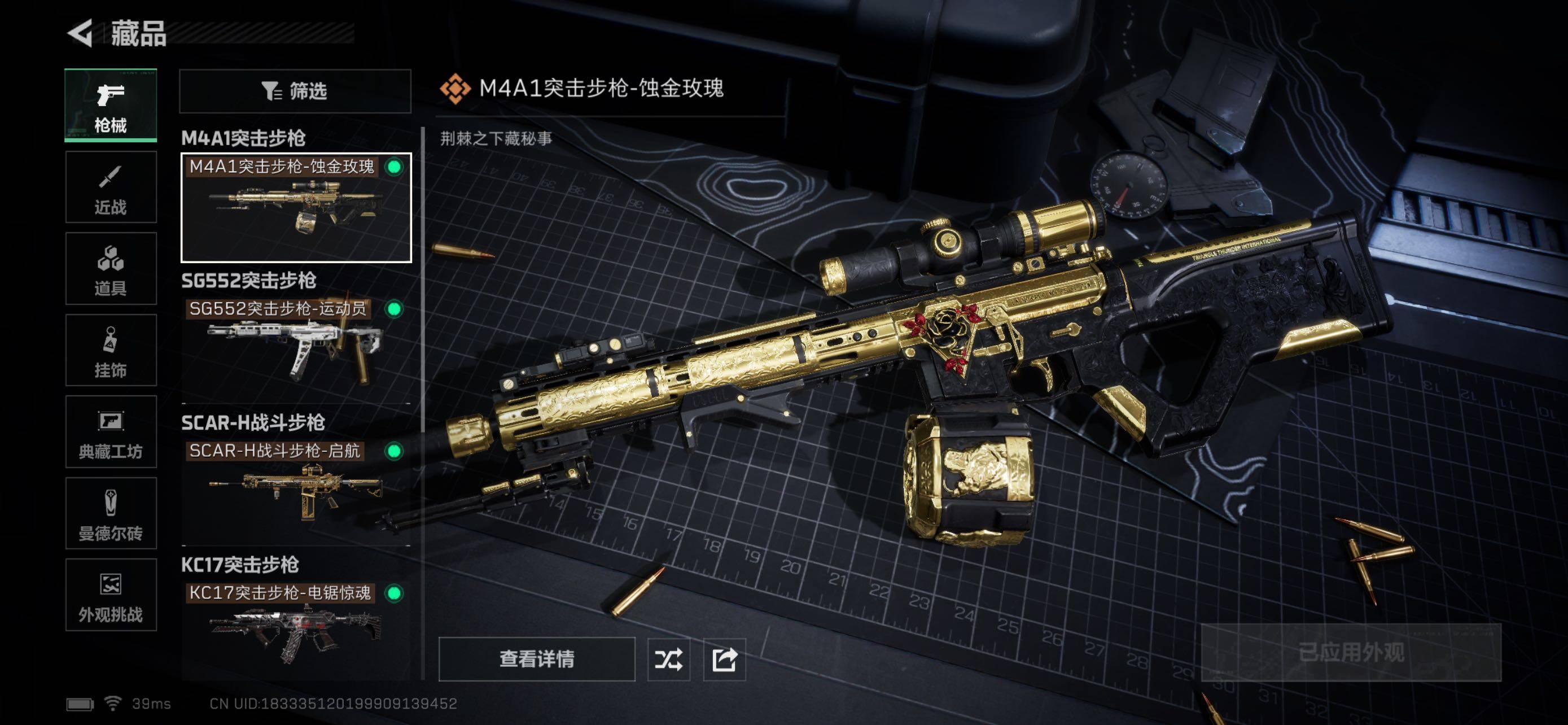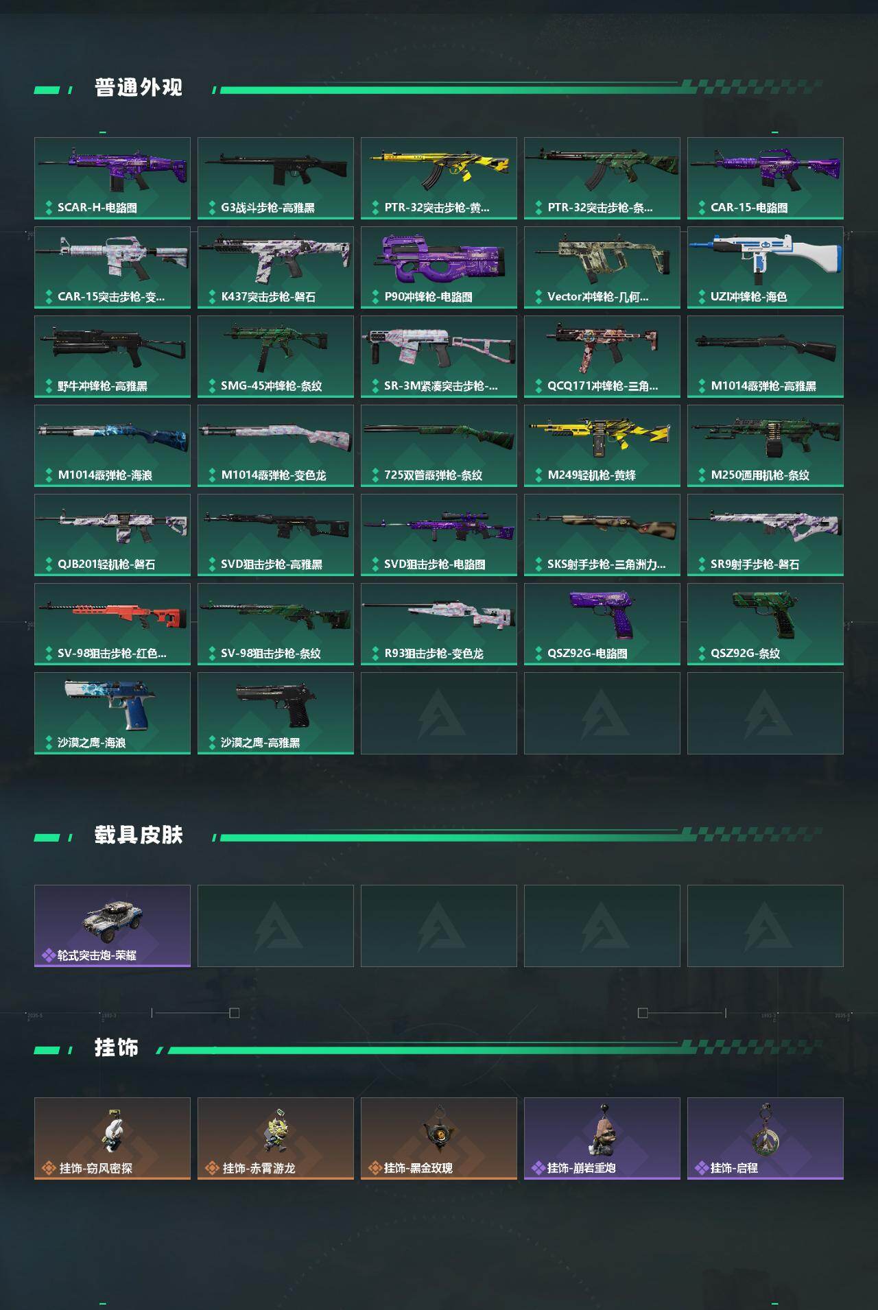 【传说外观】:M4A1突击步枪-蚀金玫瑰,SG552突击步枪-运动员,SCAR-H战斗步枪-启航,KC17突击步枪-电锯惊魂,P90冲锋枪-信条,M250通用机枪-骑士之心,SR-25射手步枪-信条