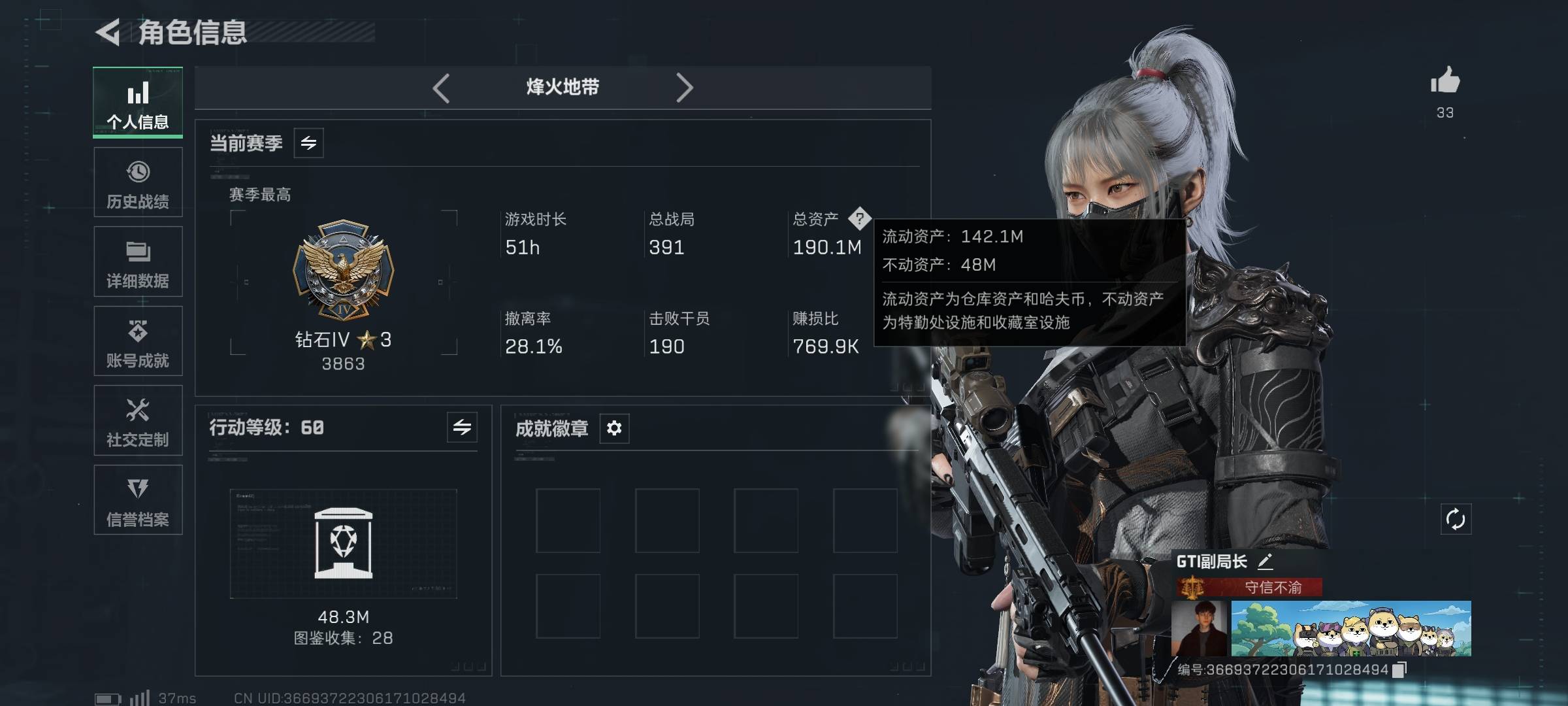 总资产190.1M 流动资产142.1M 哈夫币10961k 2刀 3红皮 高级安全箱 仓库lv9