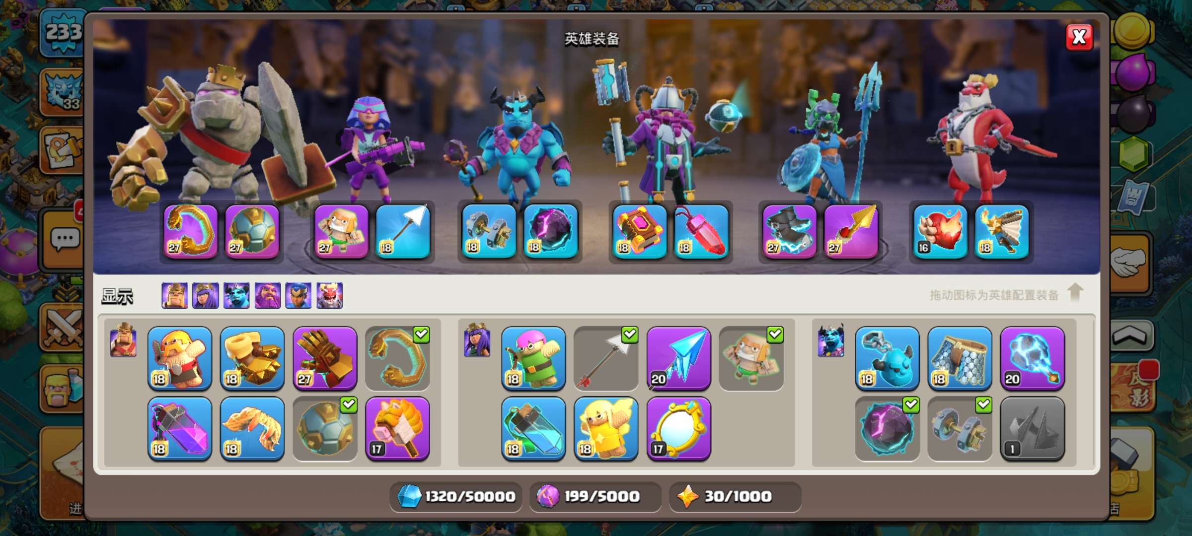 满防满王十八本,永久深海场景,热门兵种满,还有十把锤子。英雄皮肤也有,技能也基本有热门的也都满级。