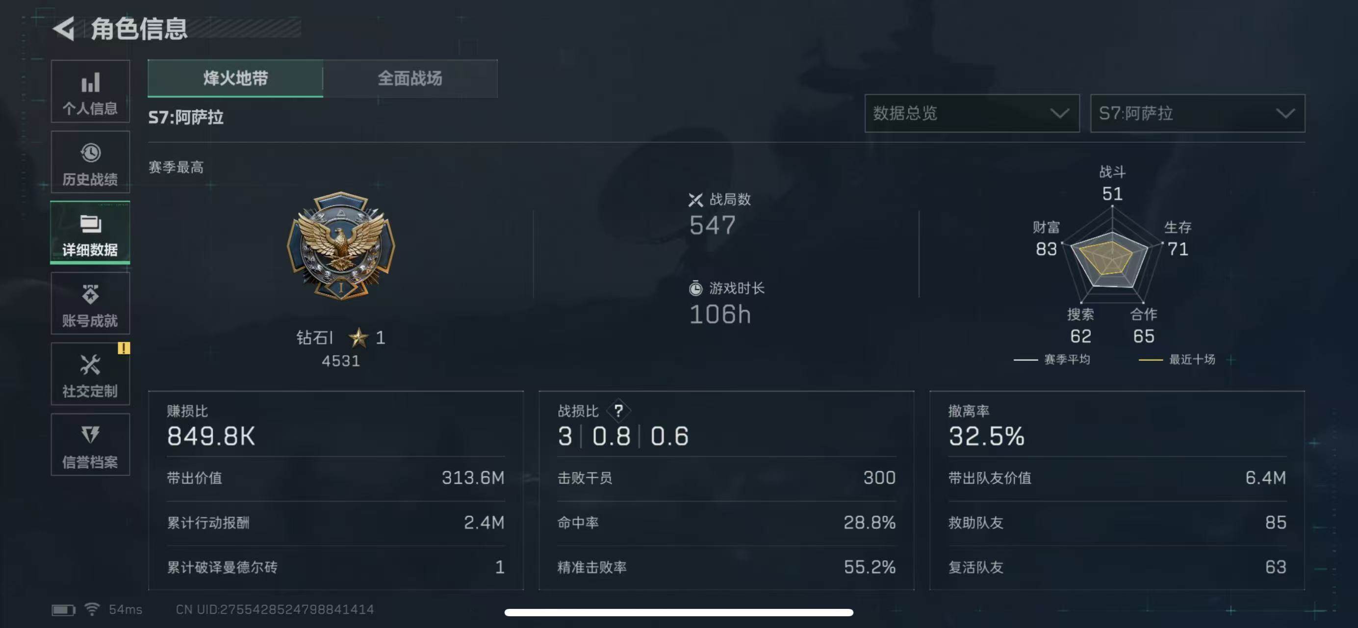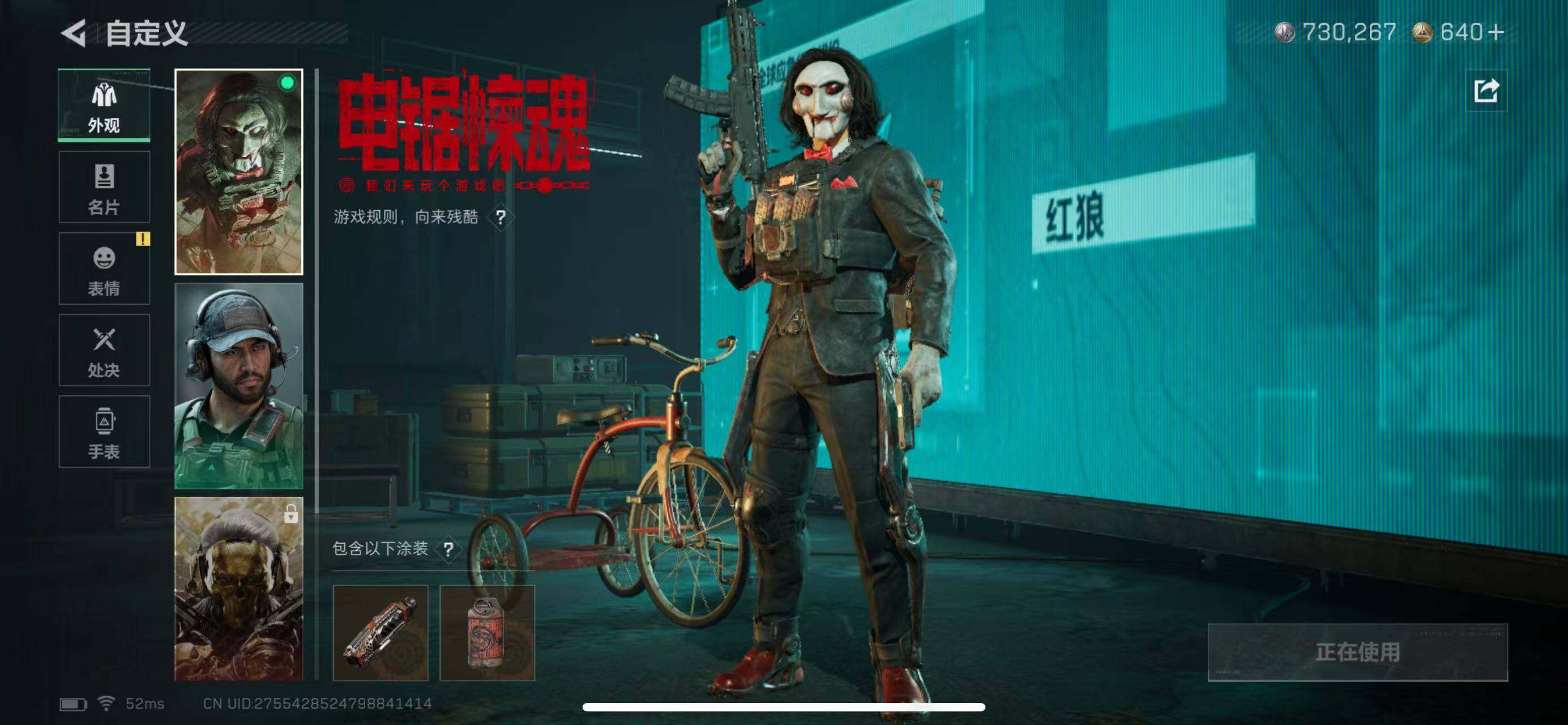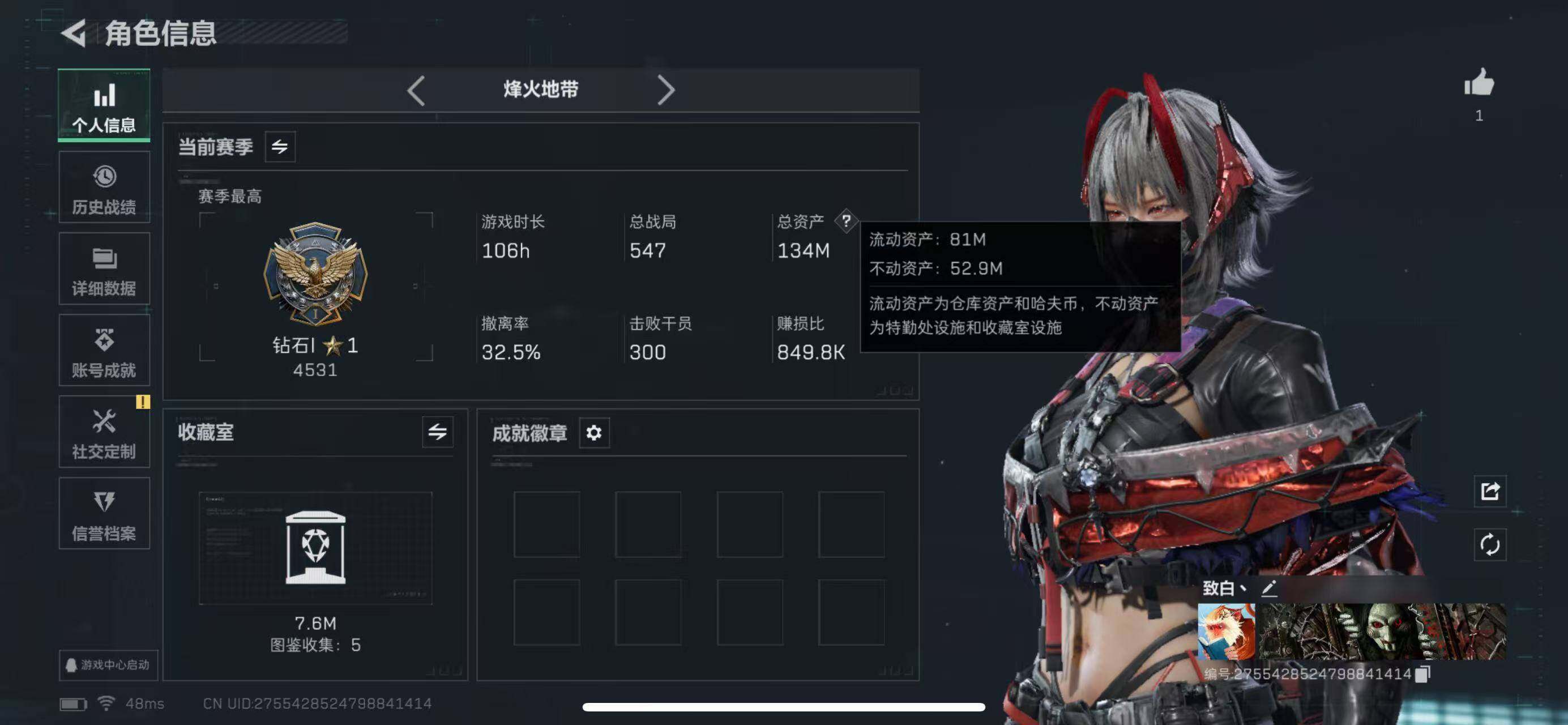 行动等级:60 总资产:135M 哈夫币:12.4W 干员皮肤:电锯惊魂,