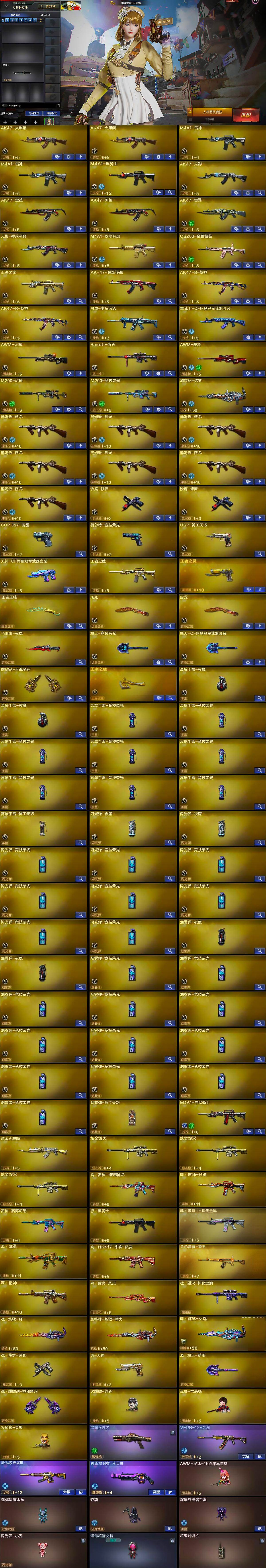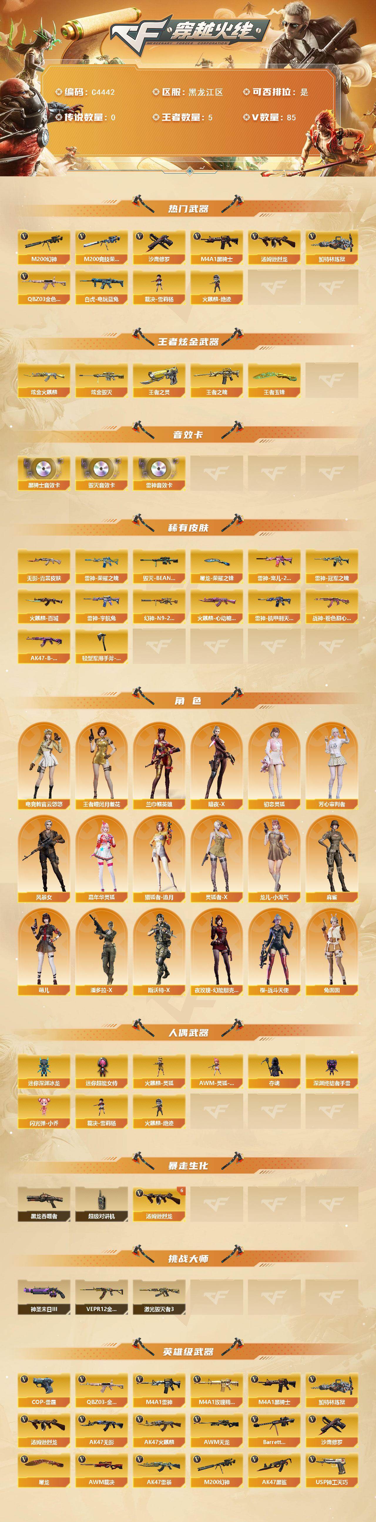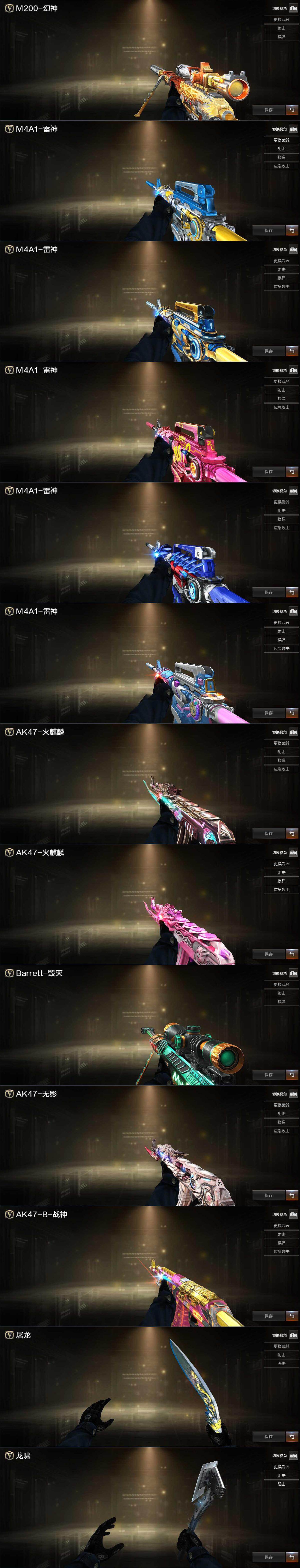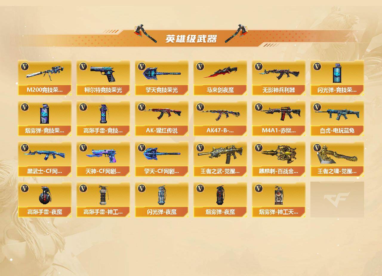 【热门武器】:QBZ03-金色蔷薇,M200-幻神,M200-竞技荣光,白虎-电玩蓝兔,M4A1-黑骑士,汤姆逊-烈龙*7,加特林-炼狱,裁决-雪莉杨,火麒麟-绝迹,沙鹰-修罗*2