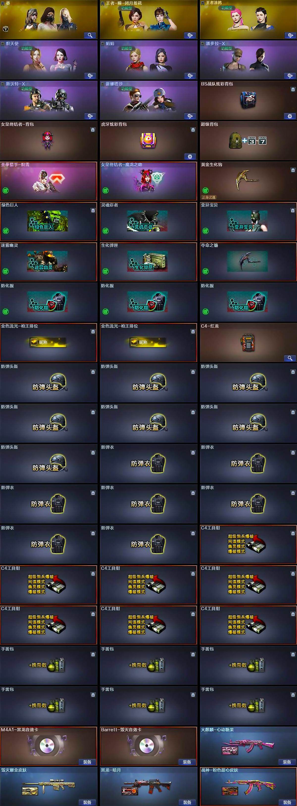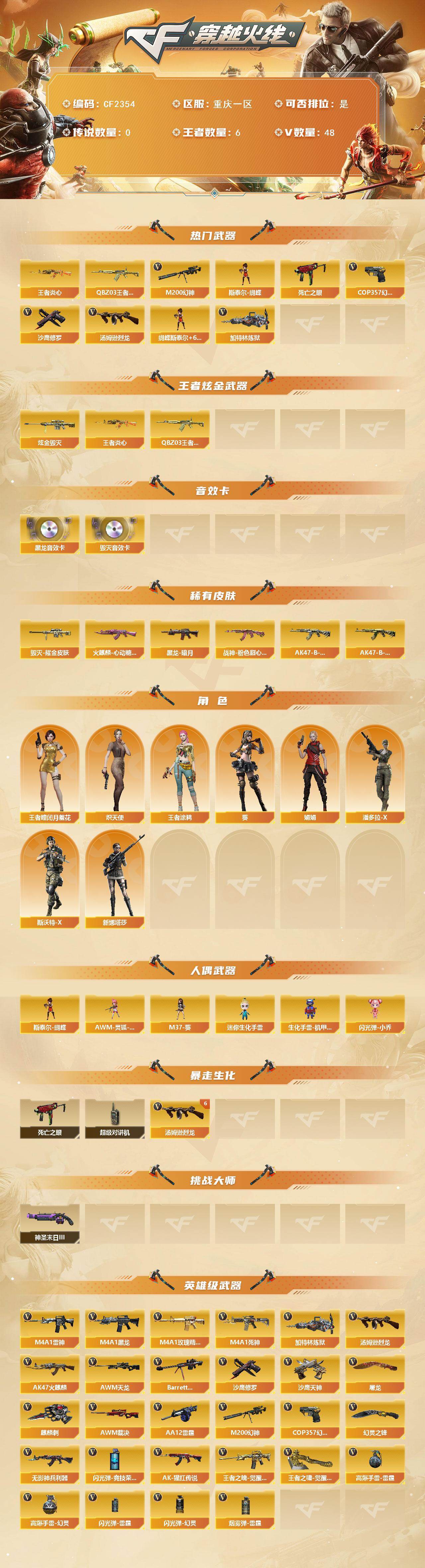 【C4329】重庆一区-48V-6王者-1炫金【双全号 M200-幻神,QBZ-03-王者蔷薇,死亡之眼*2,王者炎心,汤姆逊-烈龙*6,加特林-炼狱*2,斯泰尔-蝴蝶,COP 357-幻灵,沙鹰-修罗】