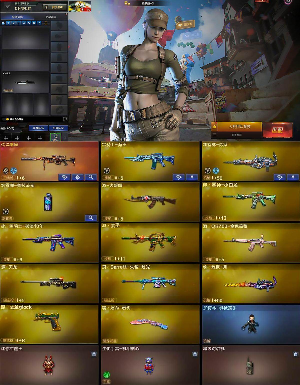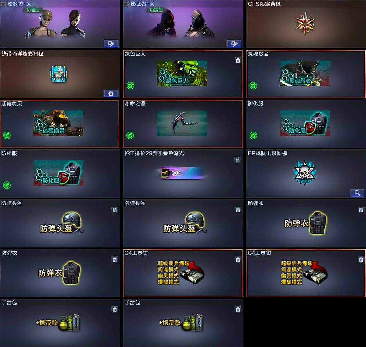 【道具】:CFS限定背包,热带奇洋炫彩背包,绿色巨人,灵魂忍者,迷雾幽灵,夺命之镰,防化服*2,枪王排位29赛季金色流光,EP战队击杀图标,防弹头盔*2,防弹衣*2,C4工具钳*2,手雷包*2