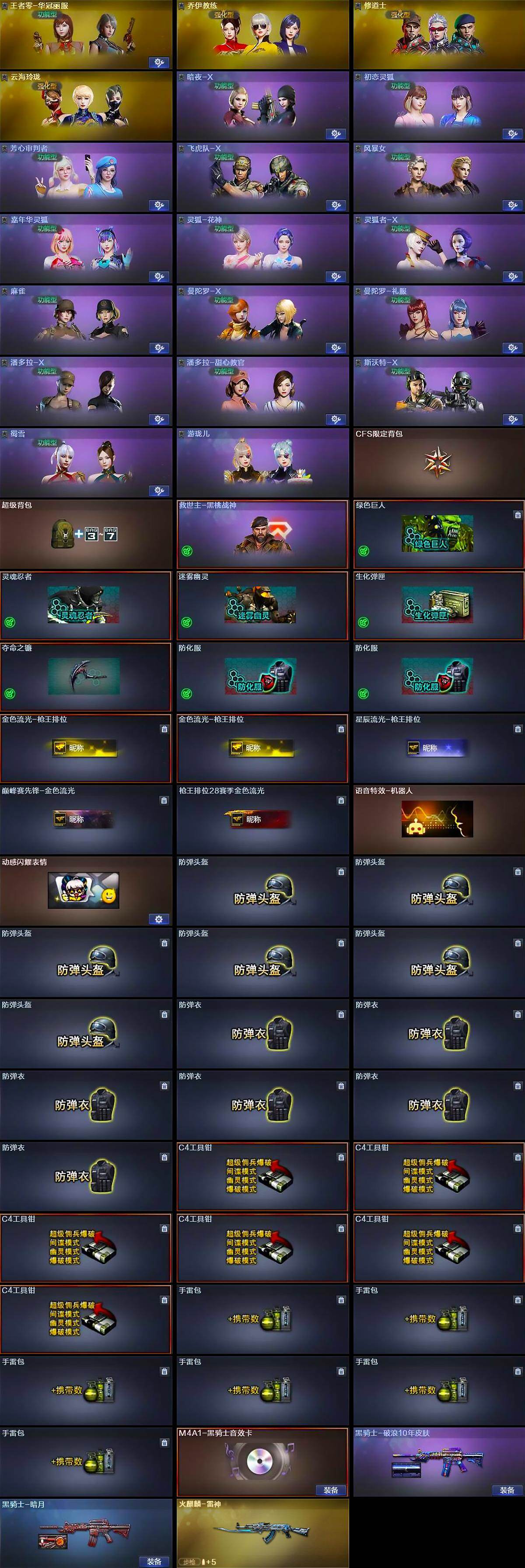 【角色】:王者零-华冠丽服,乔伊教练,修道士,云海玲珑,暗夜-X,初恋灵狐,芳心审判者,飞虎队-X,风暴女,嘉年华灵狐,灵狐-花神,灵狐者-X,麻雀,曼陀罗-X,曼陀罗-礼服,潘多拉-X,潘多拉-甜心教官,斯沃特-X,蜀雪,游珑儿