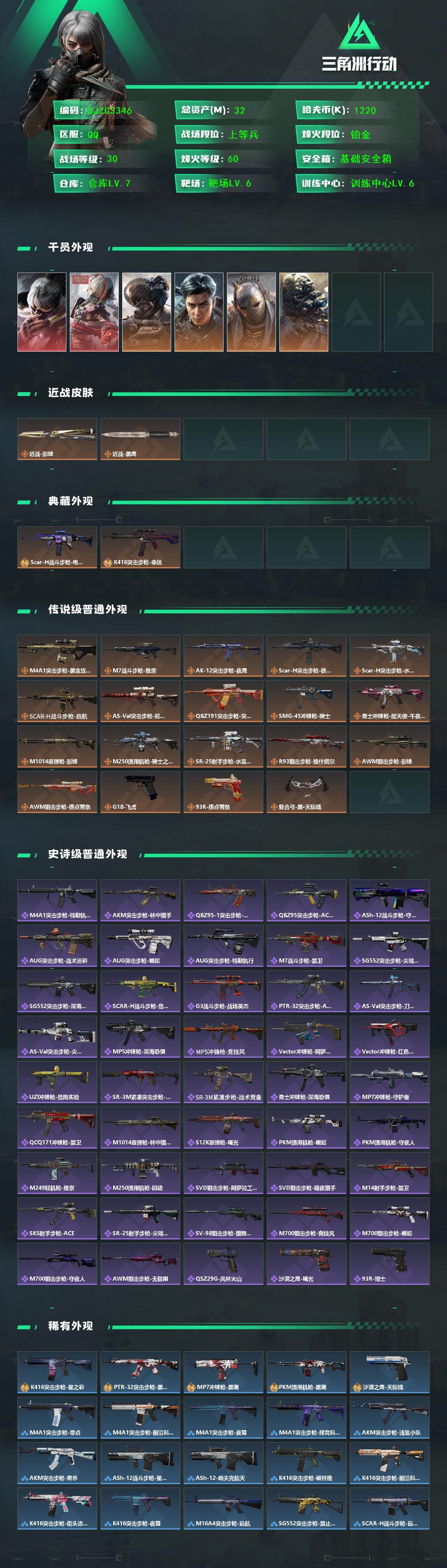 【SJZG3346】总资产(M):32M/哈夫币(K):1220K/哈夫币(K):1220K/传说枪皮数:21/全面战场等级:30_段位:上等兵/烽火地带等级:60_段位:铂金/骇爪-水墨云图/骇爪-维什戴尔/威龙-壮志凌云/威龙-飞虎/牧羊人-街头之王/无名-夜鹰/近战-影锋/近战-黑鹰/SCAR-H战斗步枪-电玩高手/K416突击步枪-命运/M4A1突击步枪-蚀金玫瑰/M7战斗步枪-维京/AK-12突击步枪-夜鹰/SCAR-H战斗步枪-铁艺苍穹/SCAR-H战斗步枪-水墨云图/SCAR-H战