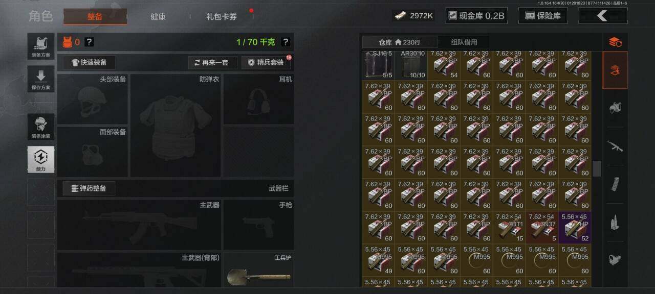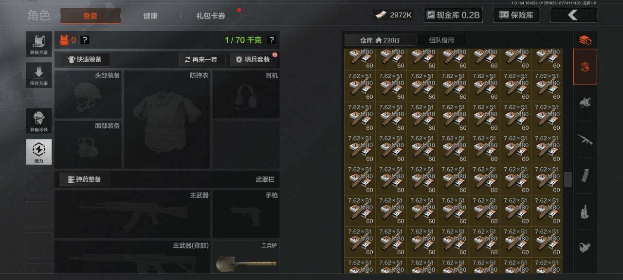 仓库价值(百万):168/工兵铲/告丧夜曲AR57/竞技FAL/旗帜AEK/旧王圣谕QBZ191/利齿风暴MPX/棱光裂变QBU191