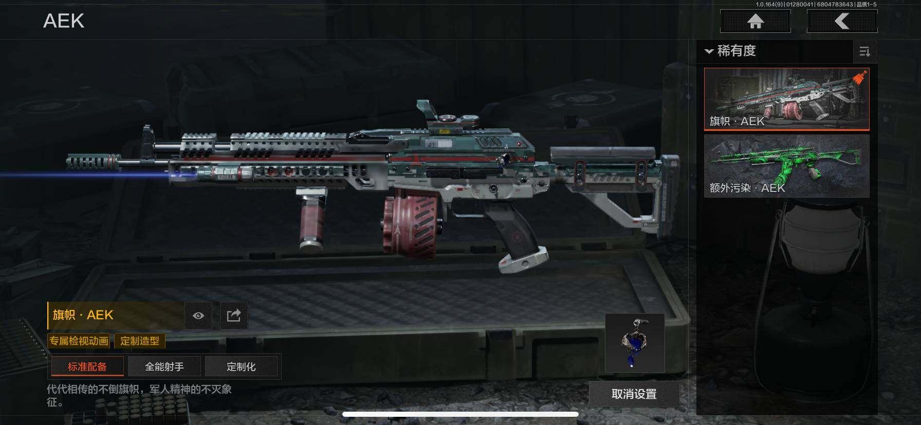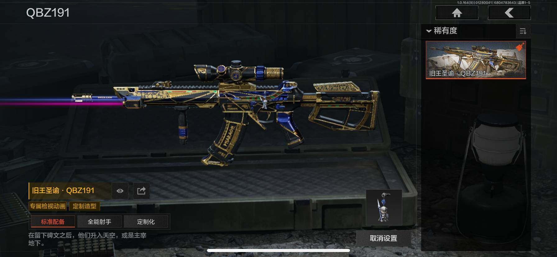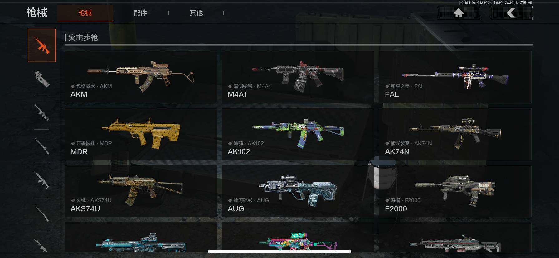 仓库价值(百万):11/热能武器补牢/涂鸦利刃/白蔷薇斯黛拉/冰河碎影AUG/旗帜AEK/旧王圣谕QBZ191/旧王圣谕VSS/芭斯特