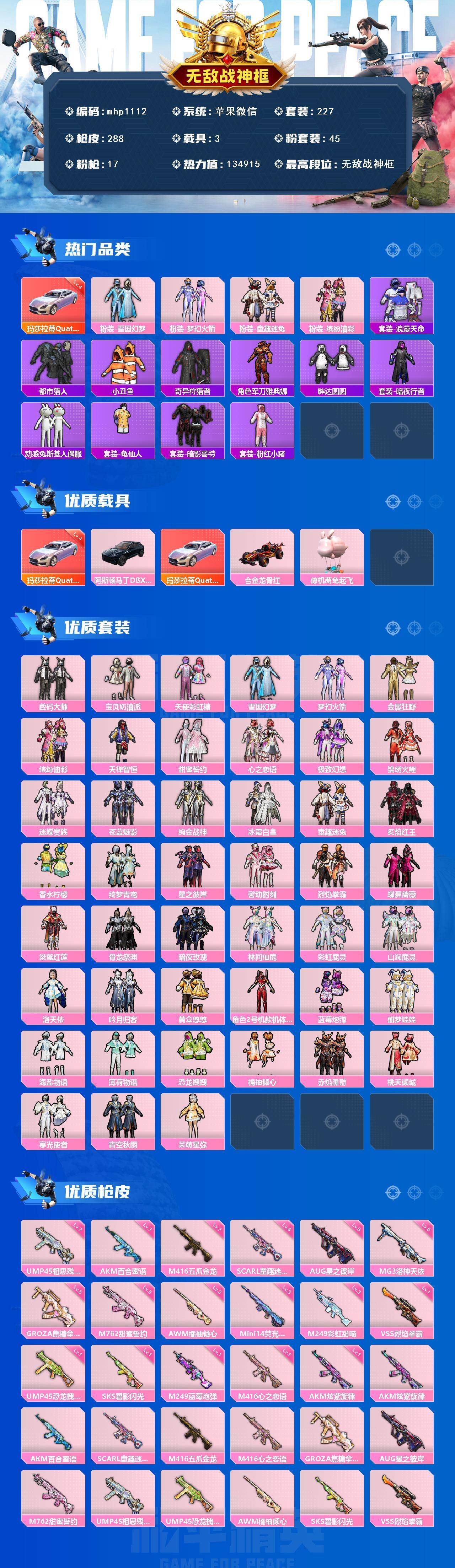 【mhp1112】苹果 微信-无敌战神框-45粉装-17特效枪-3载具-10粉色飞行器-134915热力值-18王牌印记-227套装-288枪皮