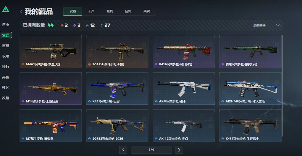 【枪皮】 M4A1突击步枪-高雅黑 QBZ95-1突击步枪-高雅黑 M4A1突击步枪-海色 QBZ95-1突击步枪-海色 QBZ191突击步枪-三角洲力量 M4A1突击步枪-黑金玫瑰 AK-12突击步枪-零点 M7战斗步枪-红色涂装 AUG突击步枪-浅蓝涂装 S