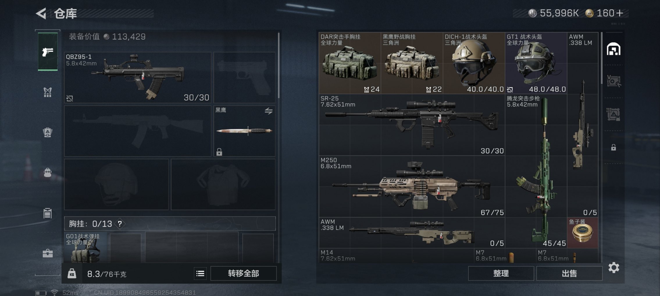 总资产179M,哈夫币55,996K,行动等级:47,仓库等级:3,训练中心等级:4,靶场等级:3,枪皮:43