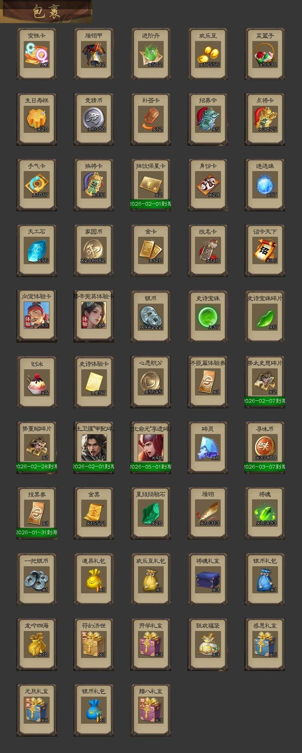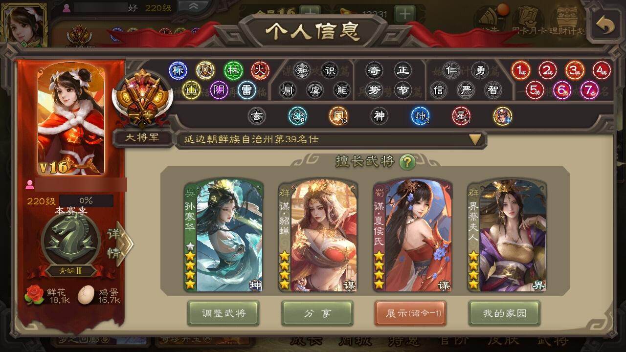 【1282】官阶:大将军;VIP等级:VIP16;史诗武将数量:83;动态皮肤数量:68;武将总数:462;史诗宝珠数量:37;将魂数量:16493;神将:12;魏国史诗武将:34;蜀国史诗武将:17;吴国史诗武将:11;群史诗武将:24