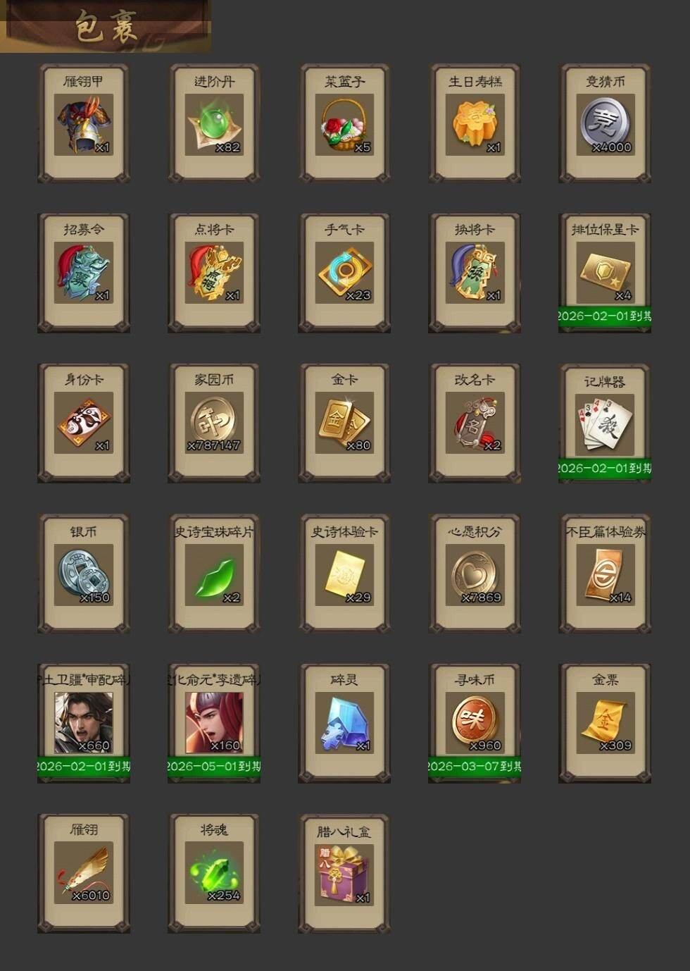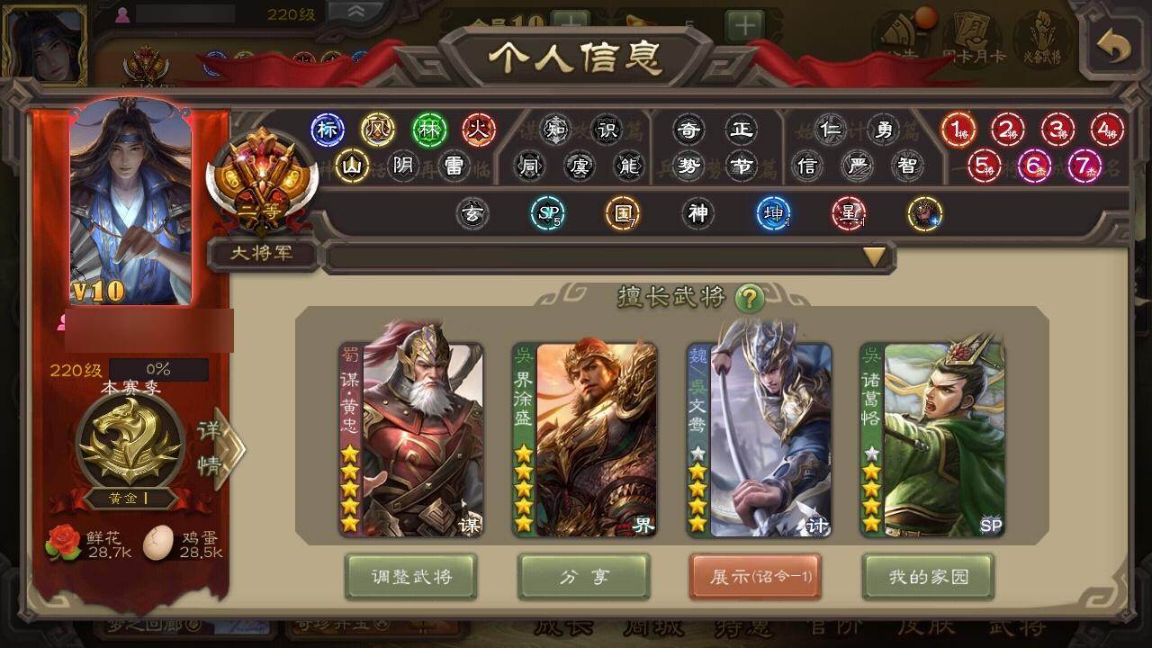 【1283】官阶:大将军;VIP等级:VIP10;史诗武将数量:59;动态皮肤数量:48;武将总数:416;史诗宝珠数量:0;将魂数量:254;神将:6;魏国史诗武将:24;蜀国史诗武将:13;吴国史诗武将:11;群史诗武将:17