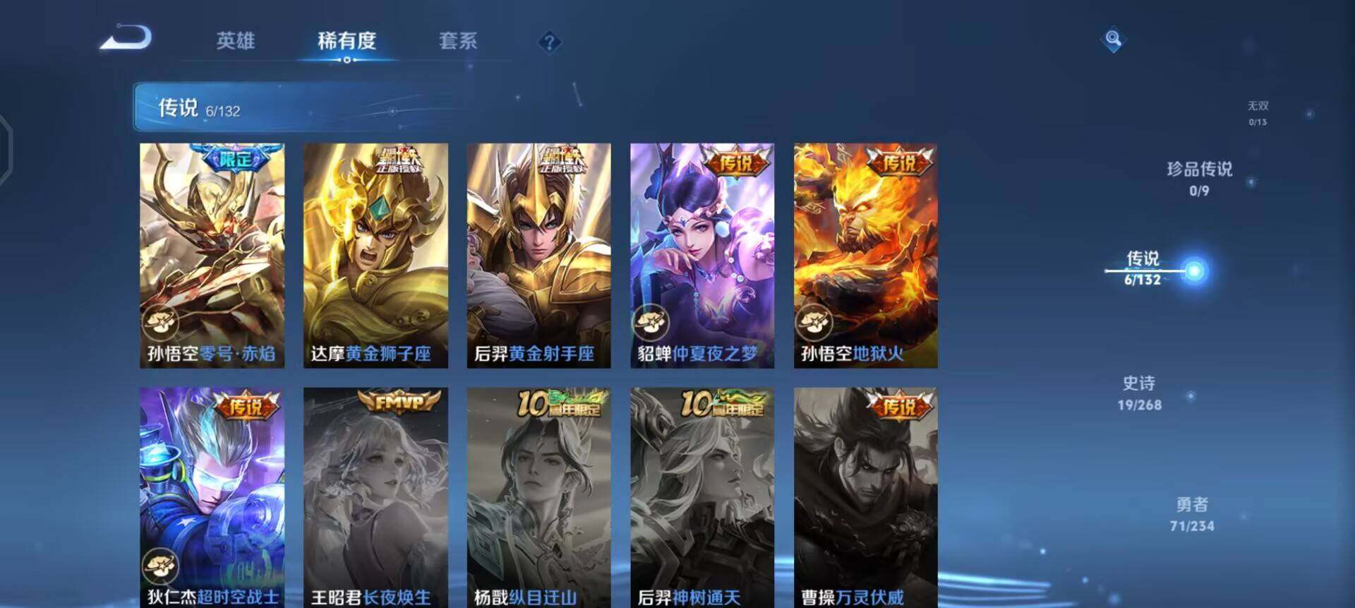 【传说皮肤】:孙悟空零号赤焰,达摩黄金狮子座,后羿黄金射手座,貂蝉仲夏夜之梦,孙悟空地狱火,狄仁杰超时空战士