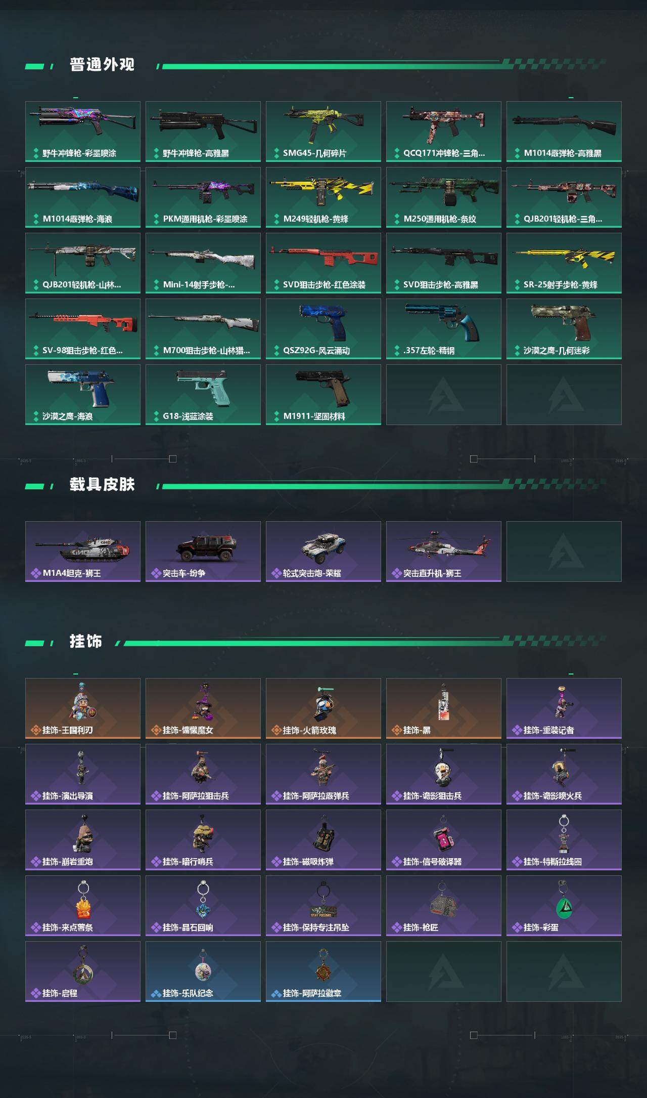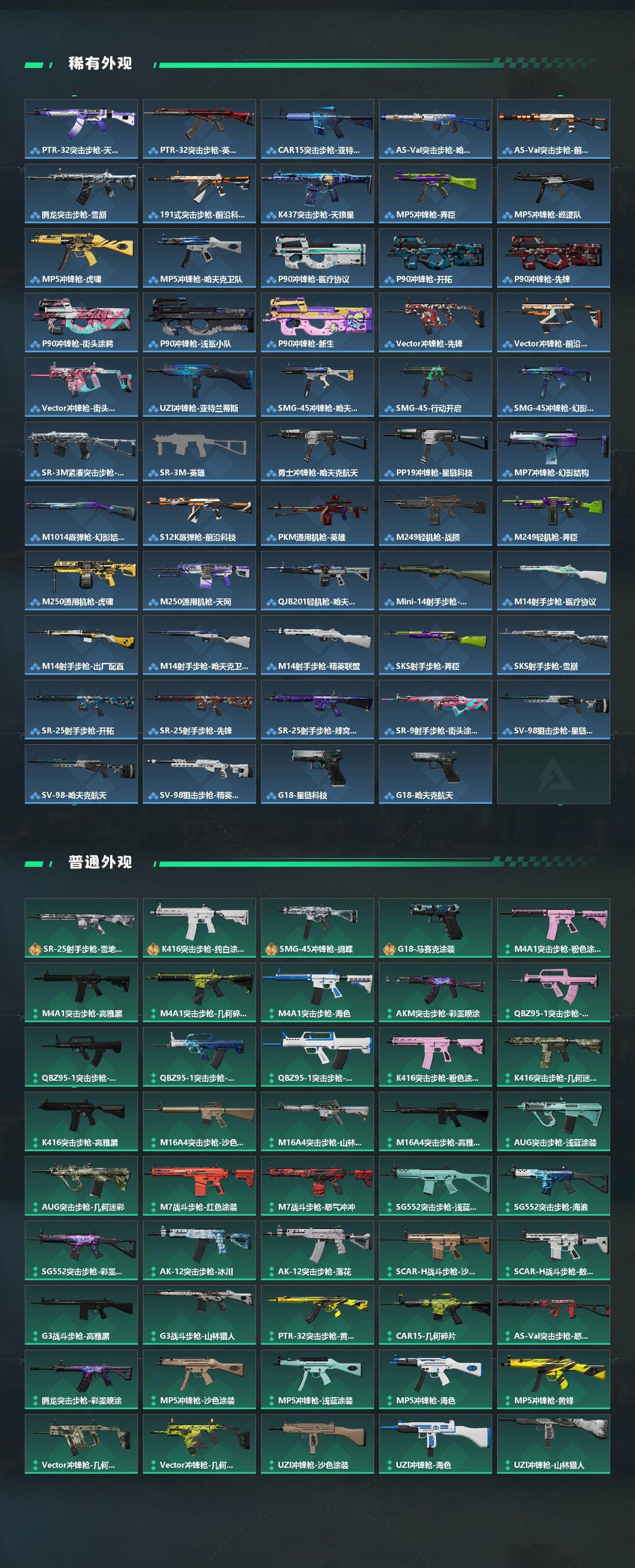 【传说外观】:M4A1突击步枪-阿米娅,QBZ95-1突击步枪-破军,AK-12突击步枪-特斯拉线圈,SCAR-H战斗步枪-水墨云图,SCAR-H战斗步枪-启航,CAR-15突击步枪-阿
