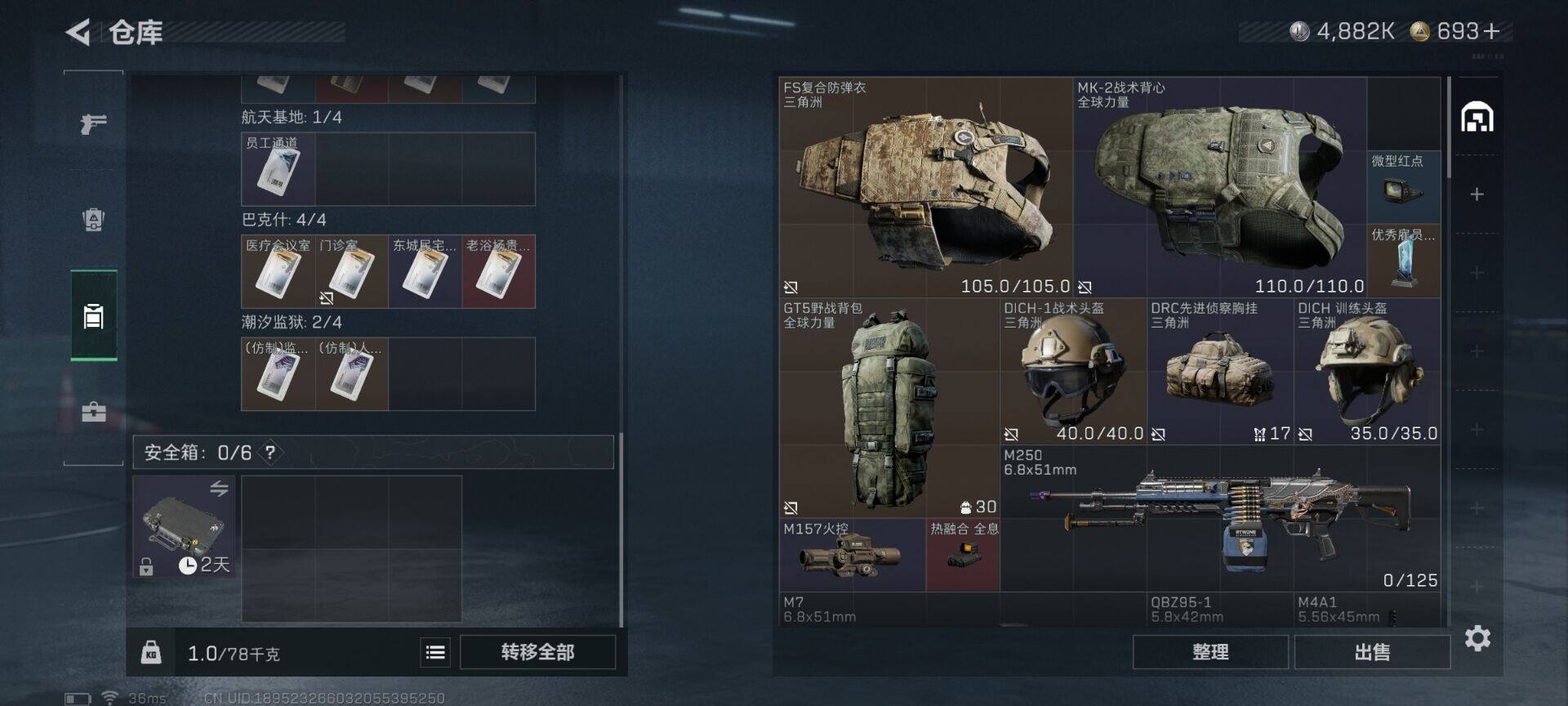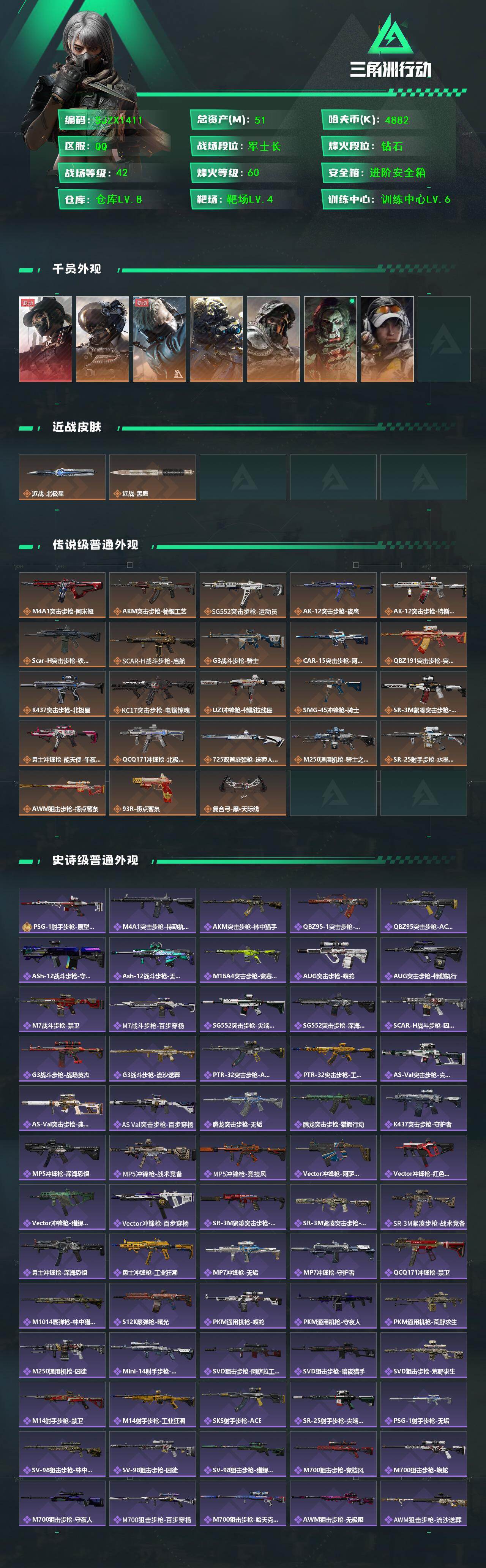 总资产(M):51M/哈夫币(K):4882K/传说枪皮数:23/全面战场等级:42_段位:军士长/烽火地带等级:60_段位:钻石/