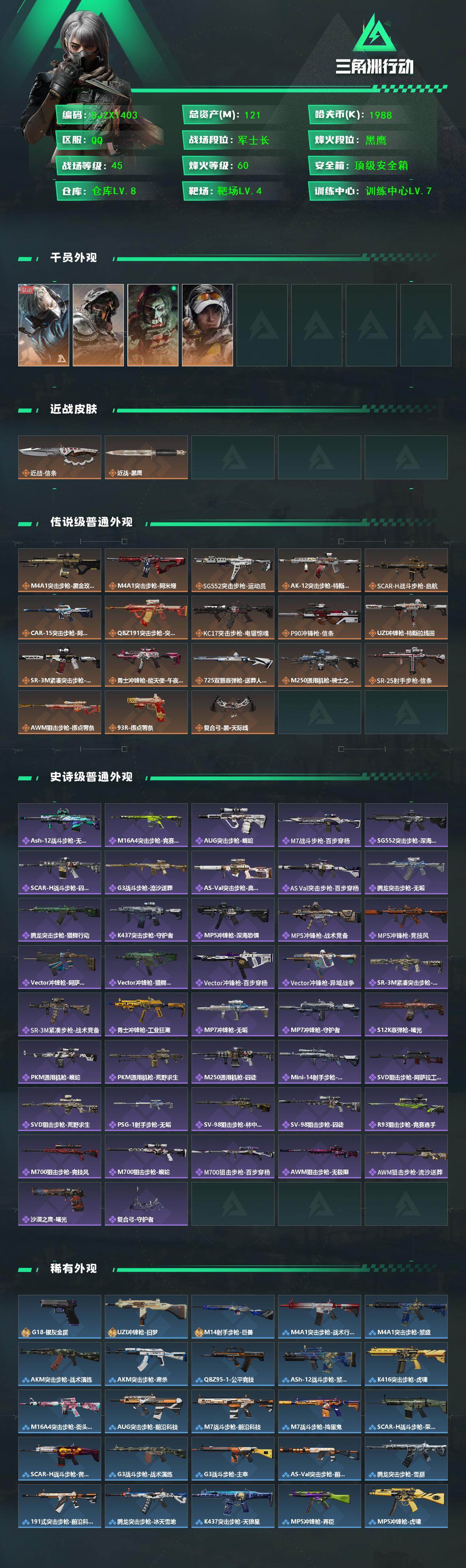 总资产(M):121M/哈夫币(K):1988K/传说枪皮数:18/全面战场等级:45_段位:军士长/烽火地带等级:60_段位:黑鹰