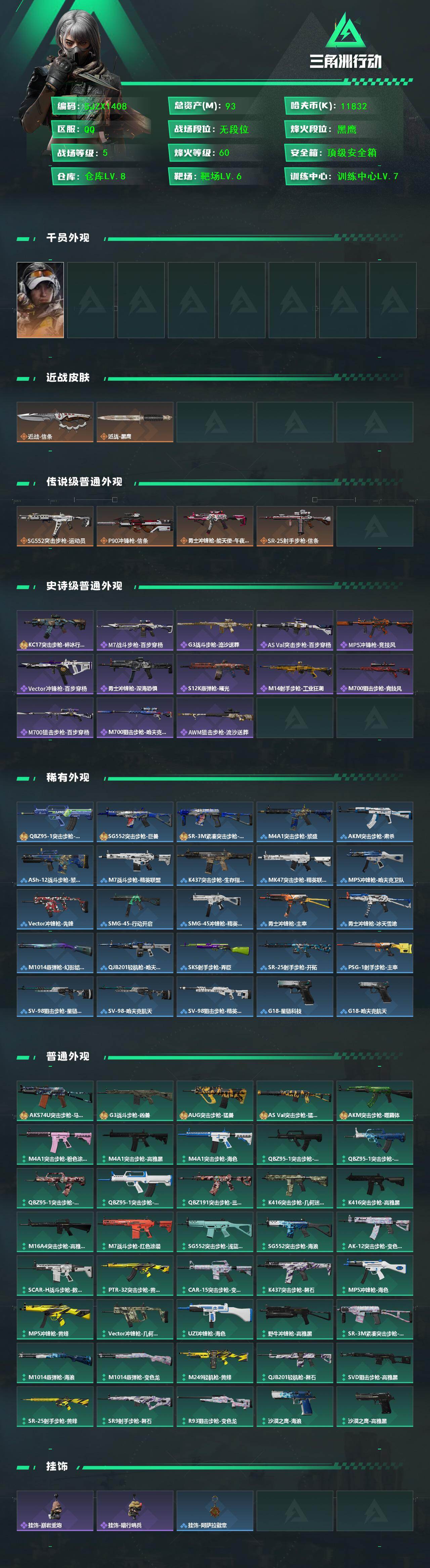 总资产(M):93M/哈夫币(K):11832K/传说枪皮数:4/全面战场等级:5_段位:无段位/烽火地带等级:60_段位:黑鹰