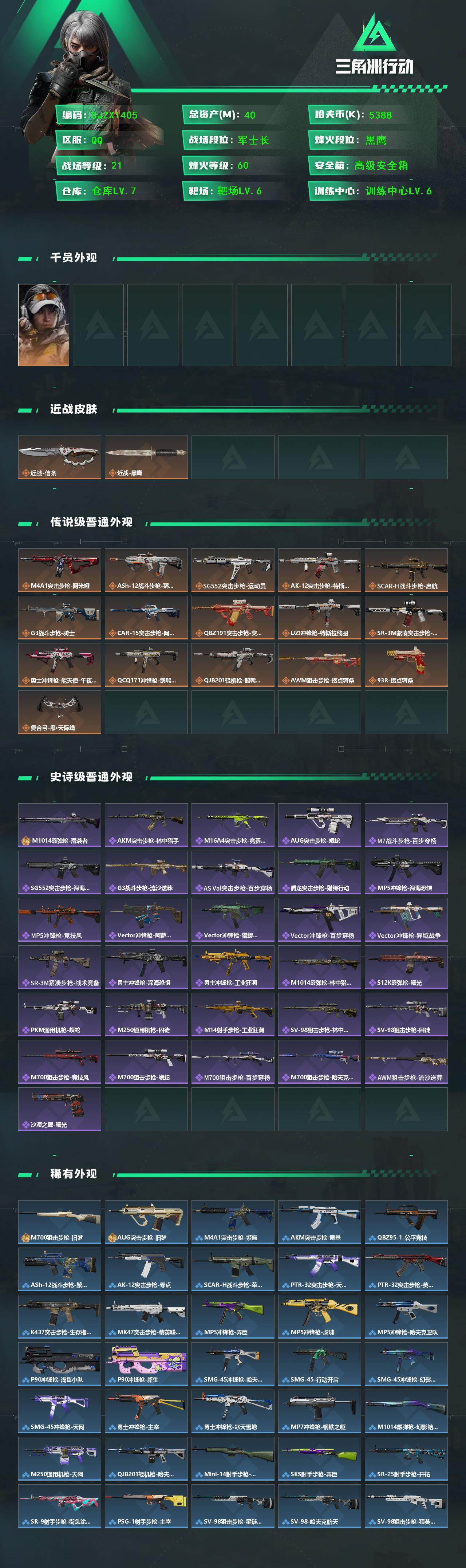 总资产(M):40M/哈夫币(K):5388K/传说枪皮数:16/全面战场等级:21_段位:军士长/烽火地带等级:60_段位:黑鹰/