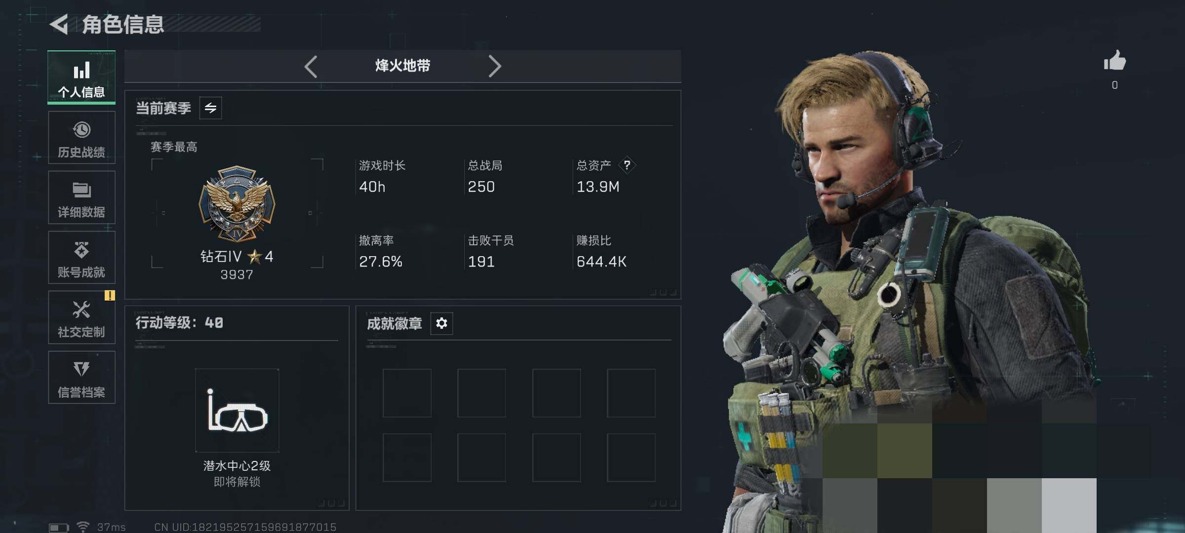 总资产(M):13M/哈夫币(K):5062K/传说枪皮数:3/全面战场等级:14_段位:列兵/烽火地带等级:40_段位:钻石/
