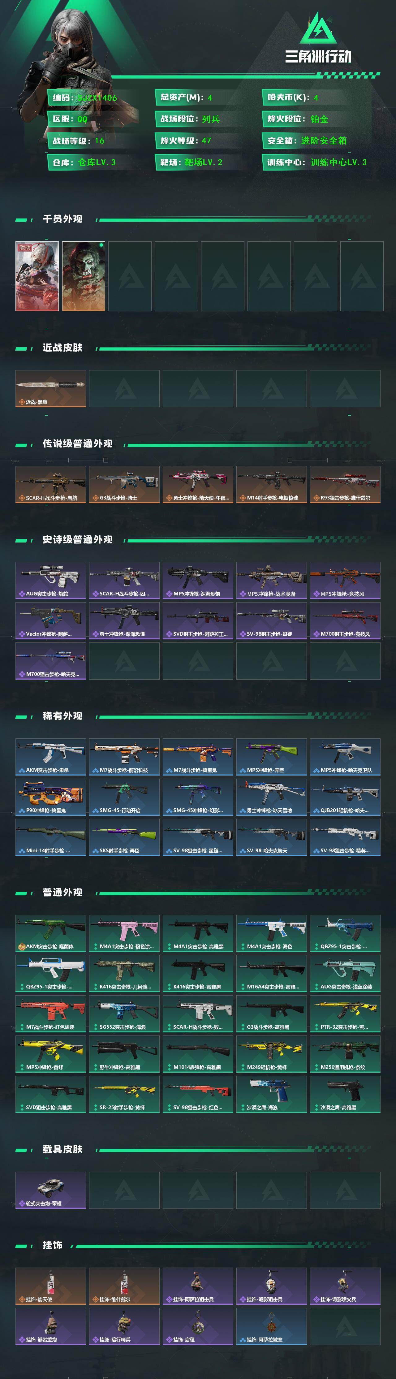 总资产(M):4M/哈夫币(K):4K/传说枪皮数:5/全面战场等级:16_段位:列兵/烽火地带等级:47_段位:铂金/